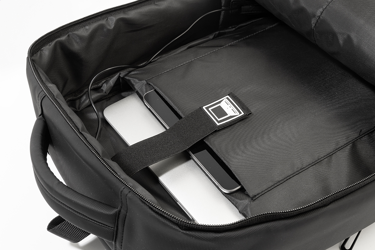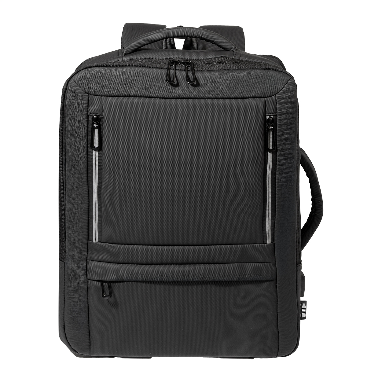 Voděodolný batoh a taška na dokumenty z RPET s možností prodloužení a hlavní přihrádkou na zip, předními kapsami s reflexními zipy, polstrovanou přihrádkou na notebook (15") a tablet (12") a vestavěným USB portem pro power banky. S popruhem na kufry, polstrovanými zády a ramenními popruhy s hrudním popruhem. Polyester 600D RPET s PU zátěrem a výrazným štítkem RPET.