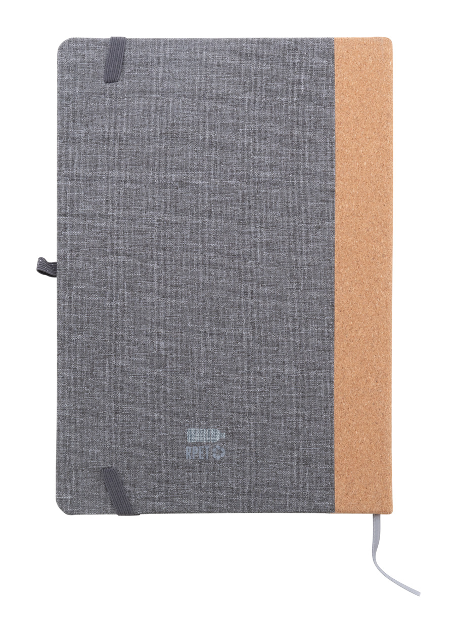 Blok A5 potažený polyesterem RPET s hřbetem z přírodního korku a 80 linkovanými listy z recyklovaného papíru. Se záložkou, gumovým páskem a držákem na pero.