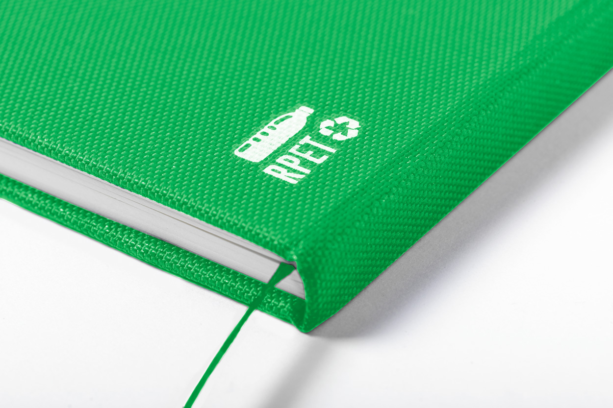 RPET blok A5 potažený polyesterem s 80 linkovanými listy, záložkou a gumičkou.