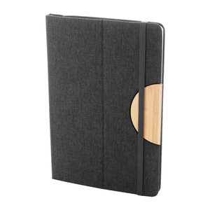 Blok A5 s deskami potaženými polyesterem RPET s bambusovou vložkou a funkcí držáku na mobil. S 80 linkovanými listy z recyklovaného papíru, záložkou a gumičkou.
