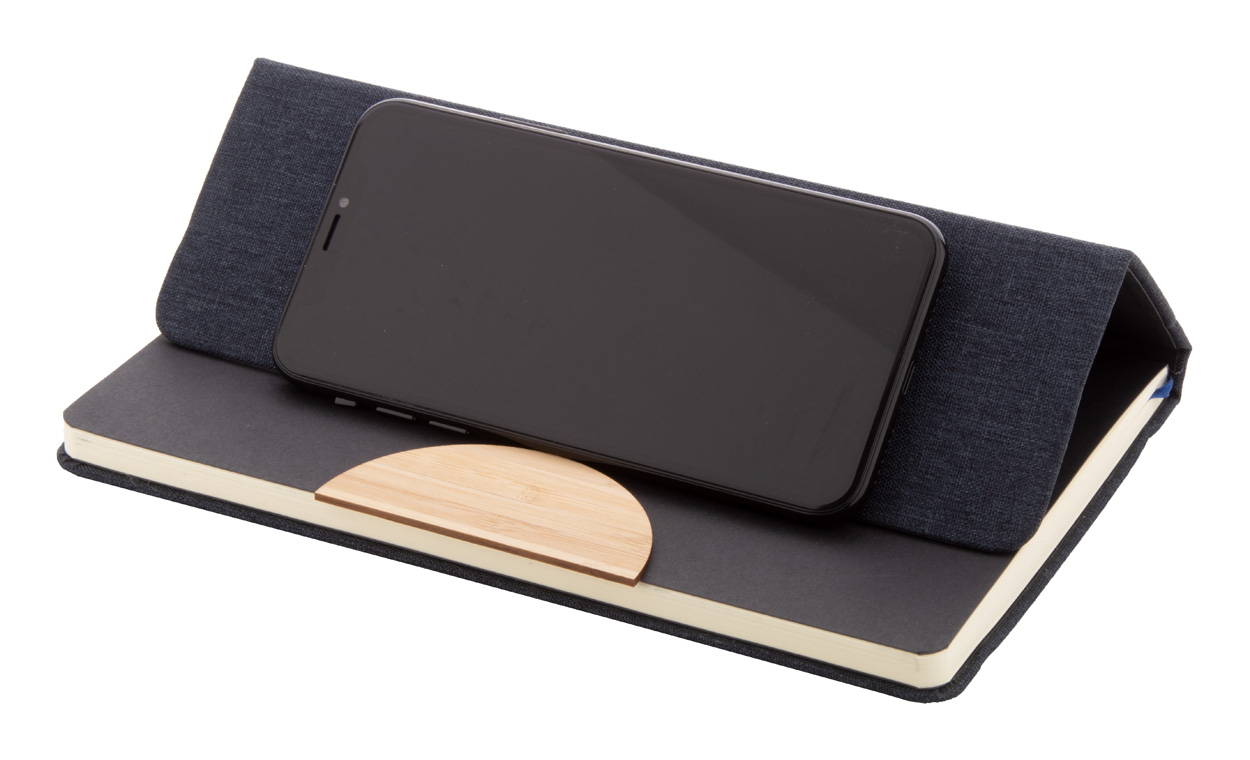 Blok A5 s deskami potaženými polyesterem RPET s bambusovou vložkou a funkcí držáku na mobil. S 80 linkovanými listy z recyklovaného papíru, záložkou a gumičkou.