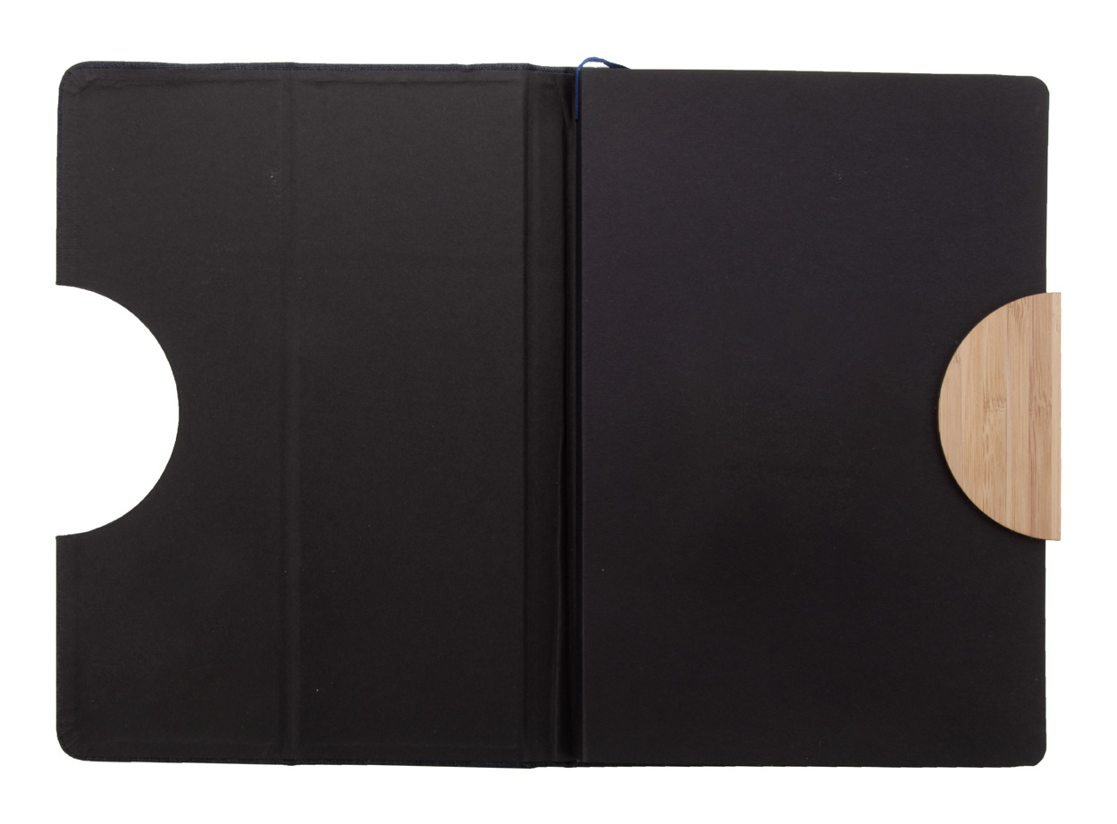 Blok A5 s deskami potaženými polyesterem RPET s bambusovou vložkou a funkcí držáku na mobil. S 80 linkovanými listy z recyklovaného papíru, záložkou a gumičkou.