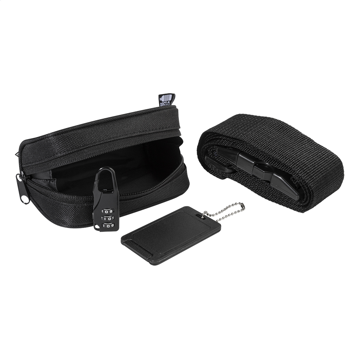 3dílná cestovní sada v pouzdře z RPET na zip. Včetně polyesterového pásu na zavazadla s 3místným zámkem, visačky na zavazadla z PP a kovového 3místného zámku na kufr. Polyester 600D RPET s charakteristickým štítkem RPET.