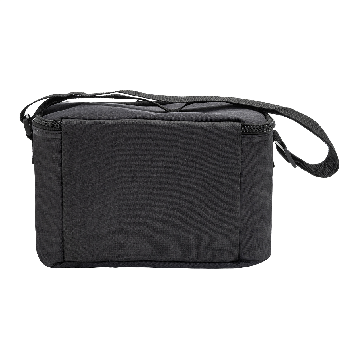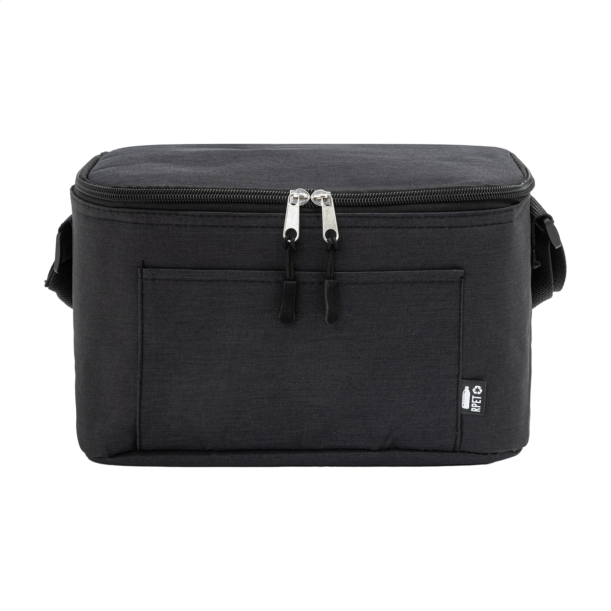Chladící taška na zip z RPET s hliníkovou vložkou, pro 6 ks 0,33L plechovek. S přední kapsou a nastavitelným ramenním popruhem. 600D RPET polyester s výrazným štítkem RPET.