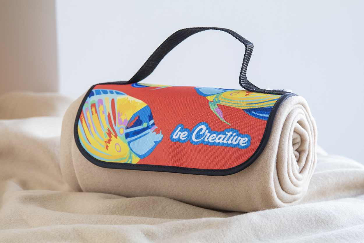 Na zakázku vyrobená RPET polární fleecová deka (200 g/m²) s rukojetí na suchý zip z 600D RPET polyesteru. Se sublimační tištěnou grafikou a výrazným štítkem RPET, cena nezahrnuje tiskovou přípravu. Min. mn.: 50 ks.