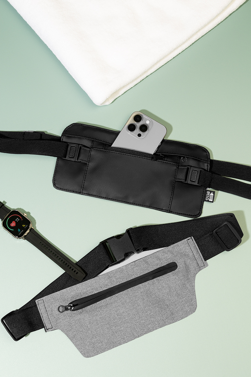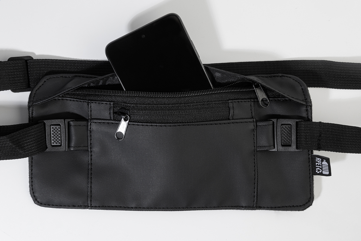 Úzká ledvinka z RPET s přední stranou potaženou PU, přihrádkou na zip a přední kapsou a nastavitelným popruhem. Polyester 600D RPET s PU zátěrem a výrazným štítkem RPET.