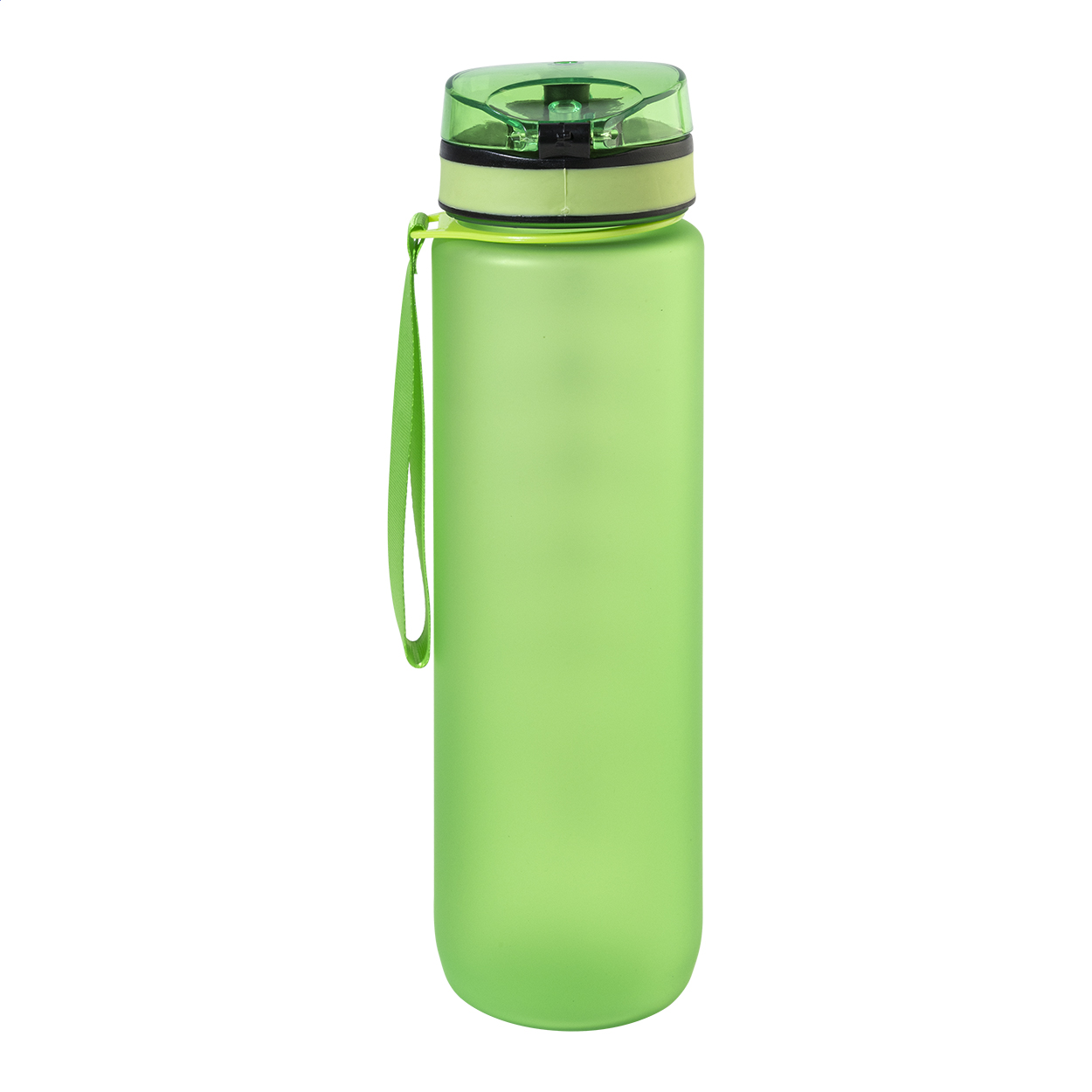 Sportovní láhev z matného RPET s motivačním objemovým a časovým značením, s automaticky otevíratelným odklápěcím víčkem s bezpečnostním zámkem a poutkem na nošení. 1000 ml. Bez BPA. Nevhodné pro sycené nápoje.