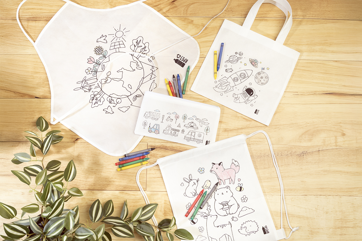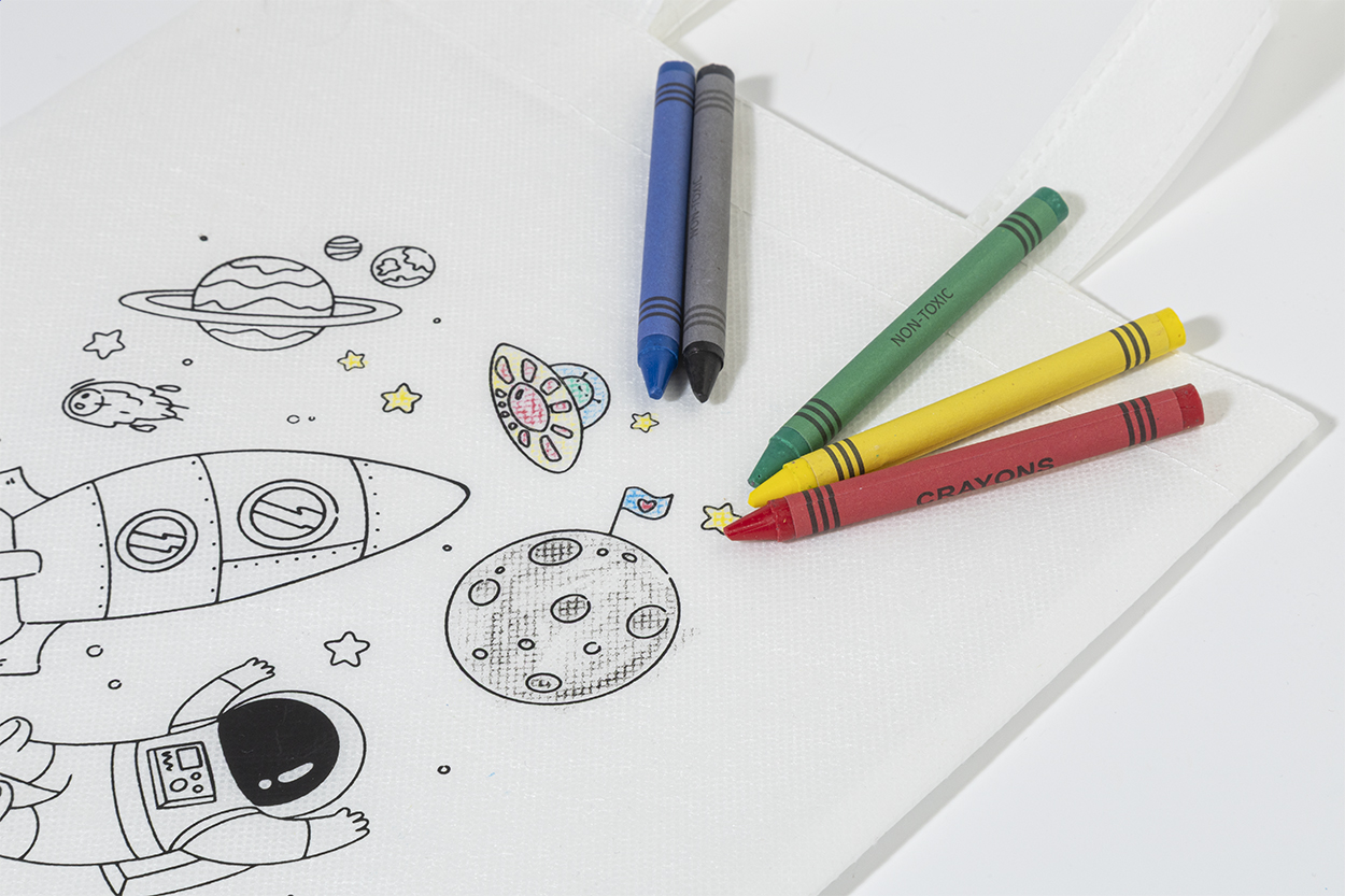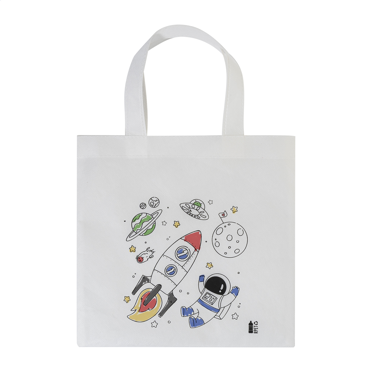 Mini nákupní taška z netkané RPET tkaniny s 5 voskovkami na vybarvení.