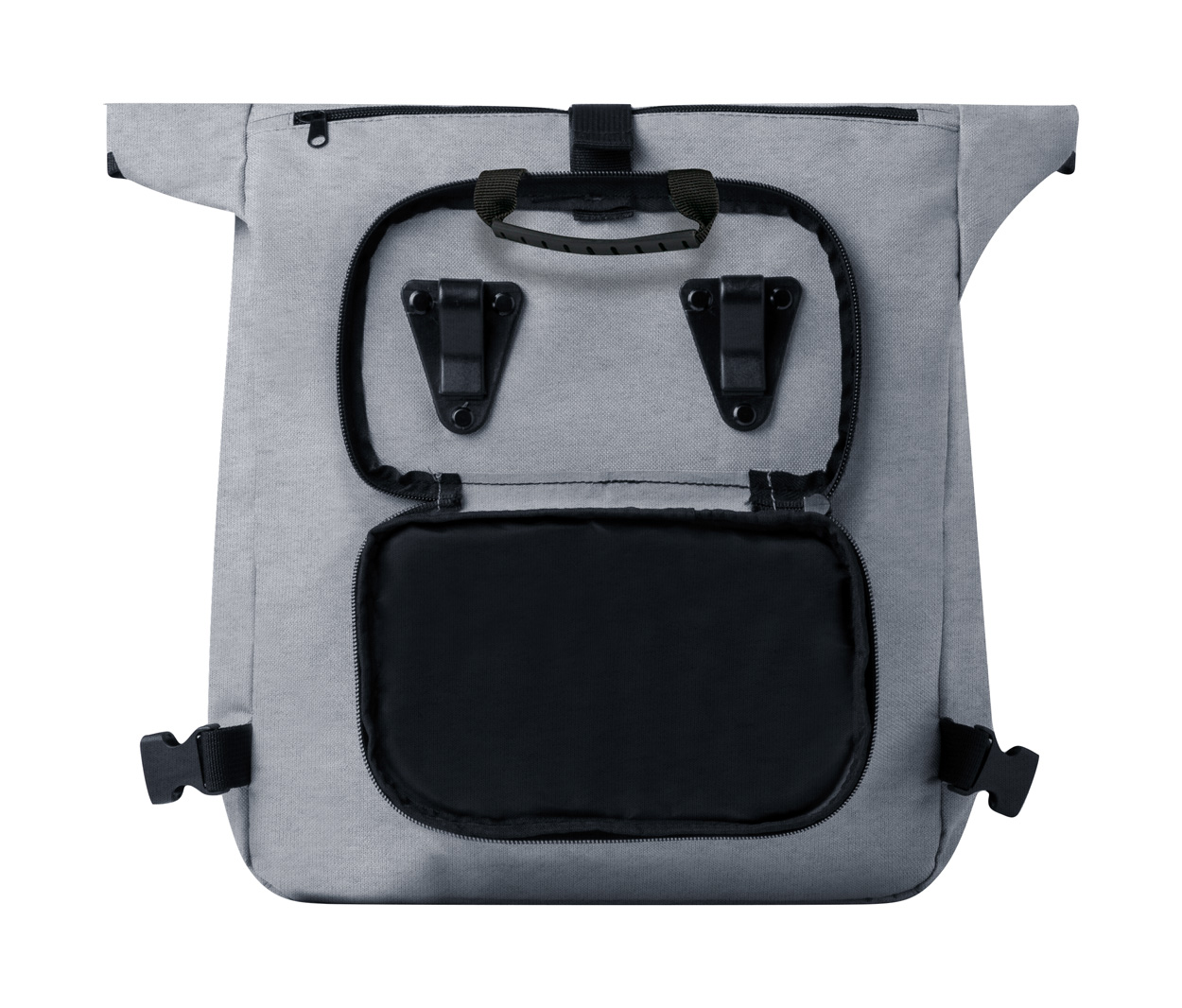 Batoh na kolo z polyesteru 600D RPET s přední kapsou na zip a odnímatelnými polstrovanými ramenními popruhy. Se skrytými svorkami pro montáž na rám.