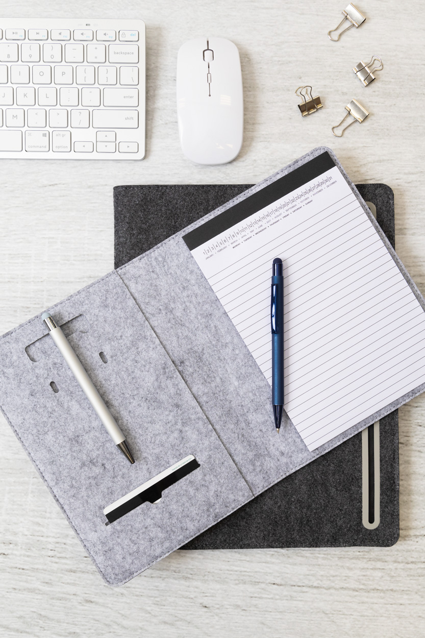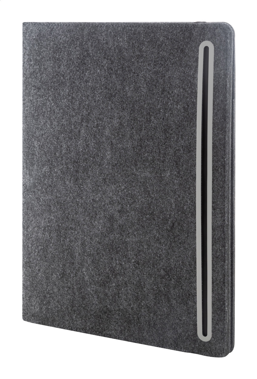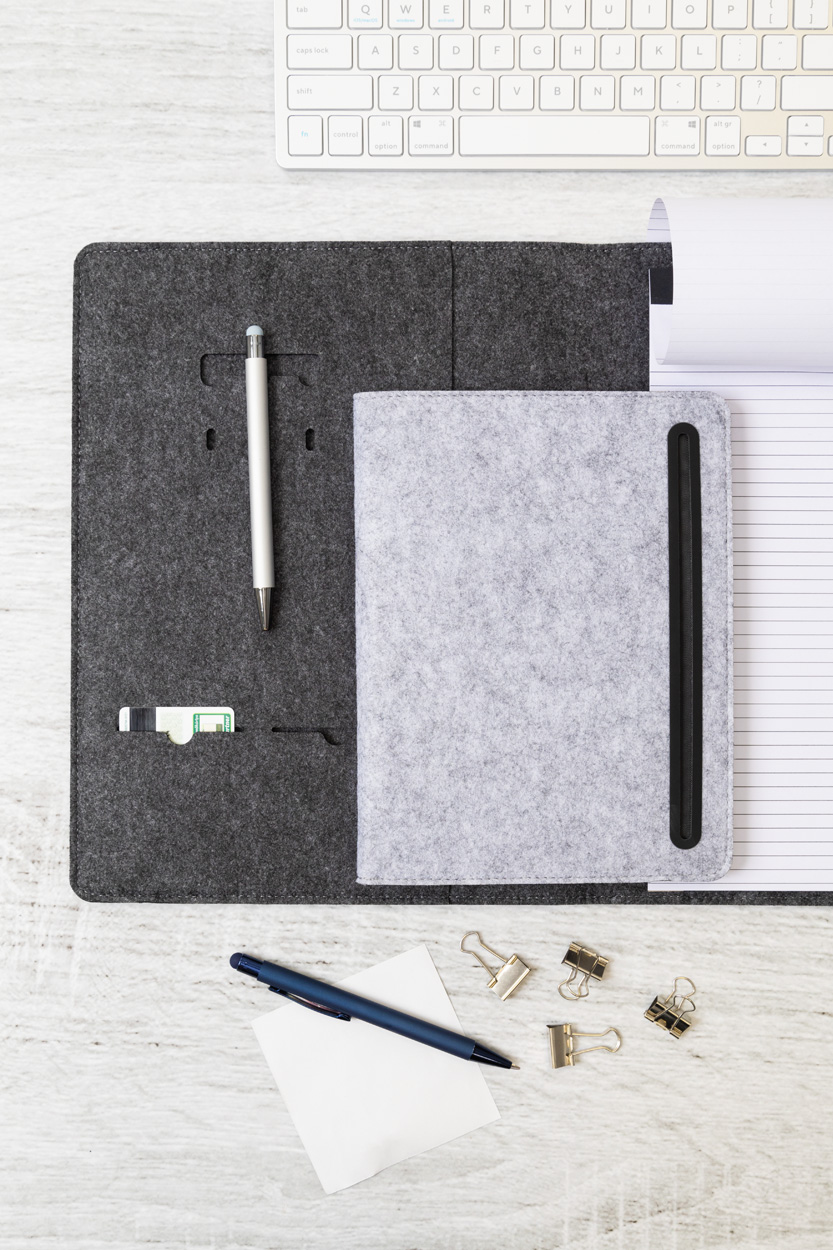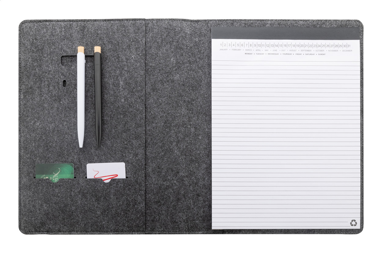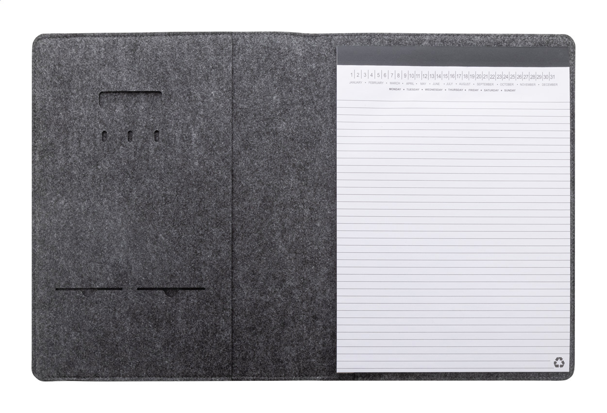 Plstěná sloha A4 na dokumenty z RPET s předními a několika vnitřními kapsami s organizérem. S 20 linkovanými listy poznámkového bloku z recyklovaného papíru.