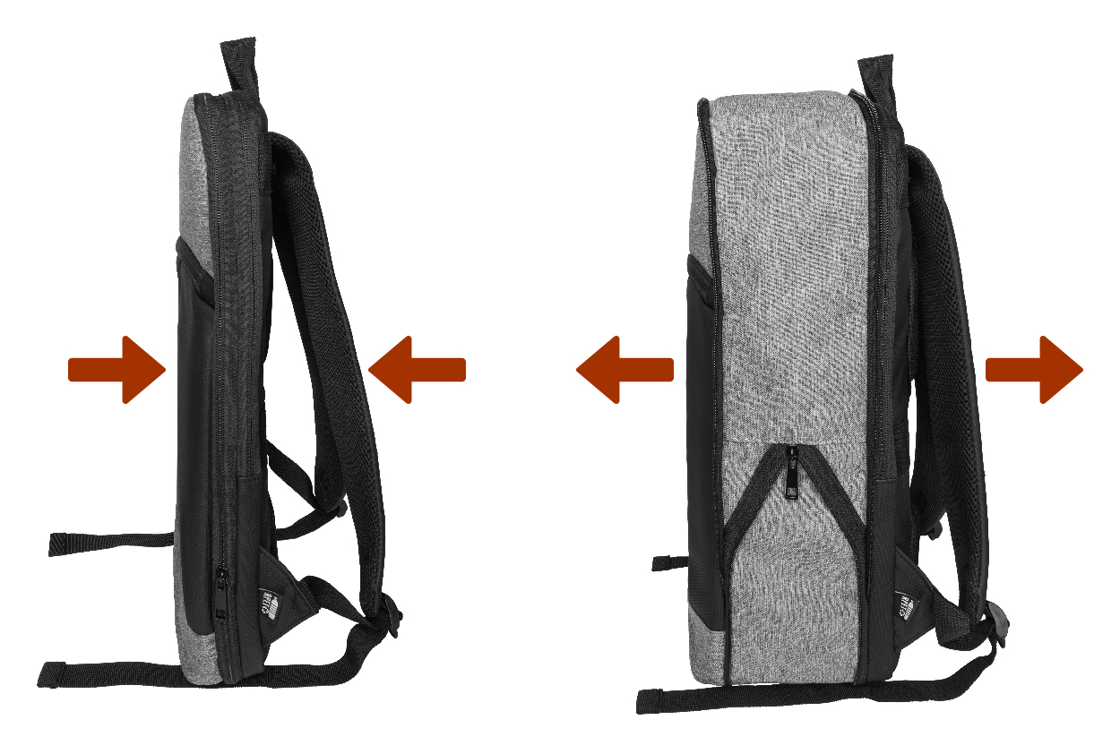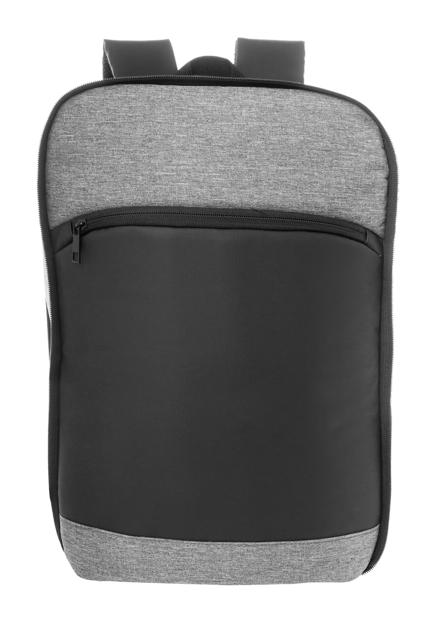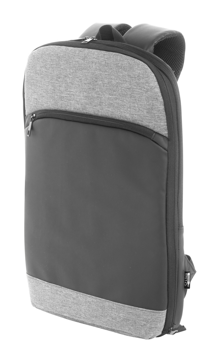 RPET rozšiřitelný batoh s hlavní přihrádkou na zip, přední kapsou na zip, polstrovanou přihrádkou na notebook (15") a přední stranou potaženou PU. S popruhem na vozík, polstrovanými zády a ramenními popruhy. 600D RPET polyester, s výrazným štítkem RPET.