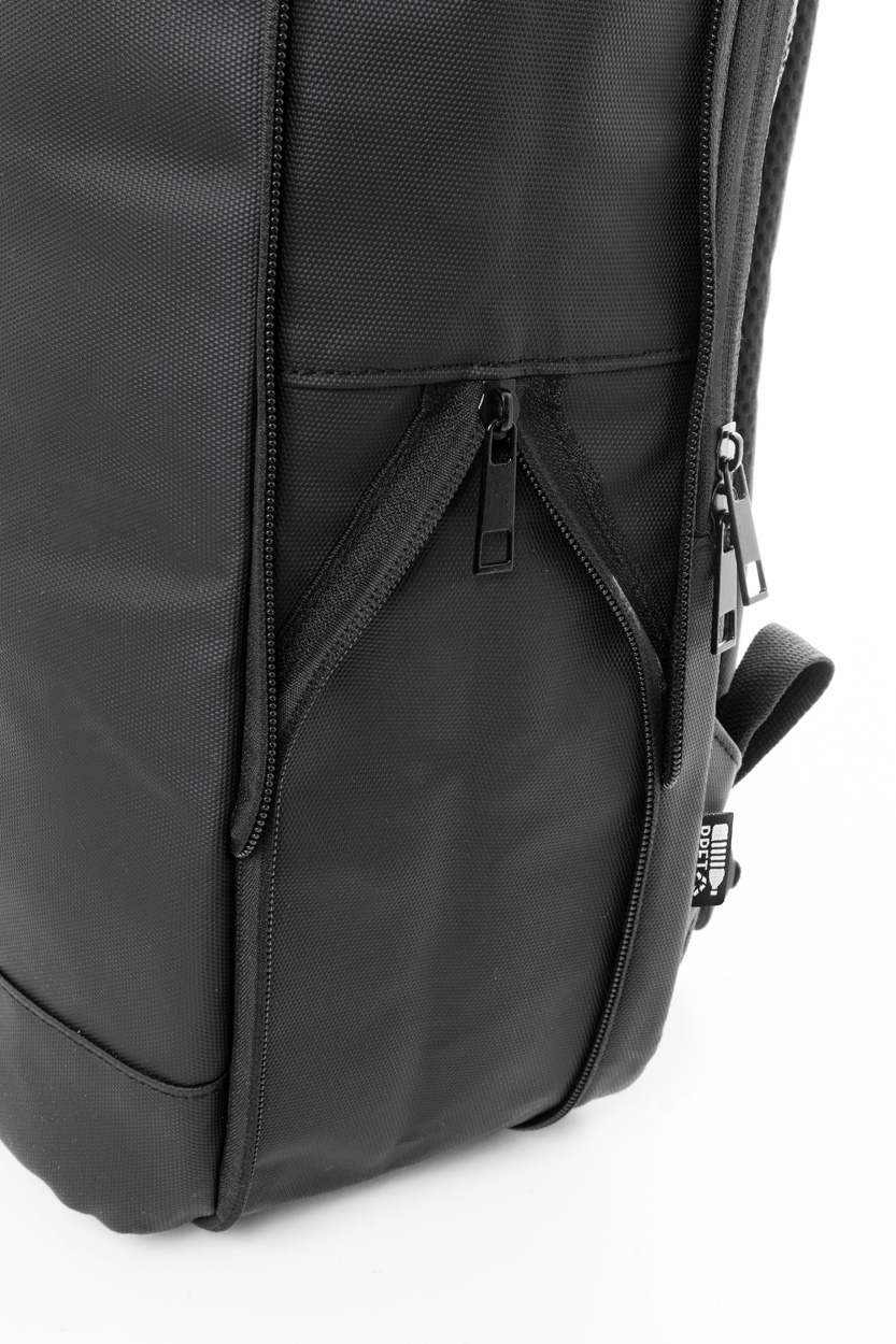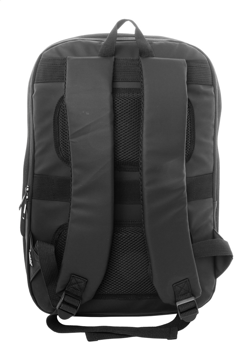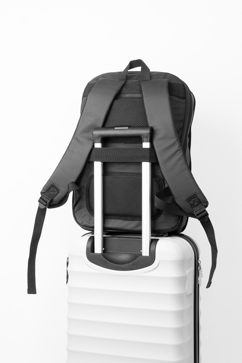 Vodotěsný, RPET rozšiřitelný batoh s hlavní přihrádkou na zip, přední kapsou na zip a polstrovanou přihrádkou na notebook (15"). S popruhem na vozík, polstrovanými zády a ramenními popruhy. Polyester 600D RPET potažený PU, s výrazným štítkem RPET.