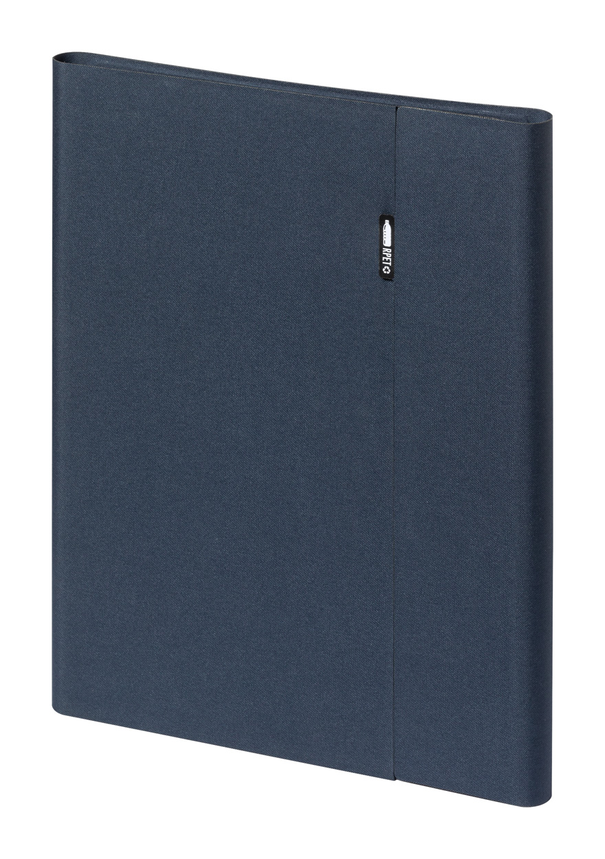 Polyesterová sloha na dokumenty A4 z 600D RPET s magnetickým zavíráním, skládacím držákem na mobil a poznámkovým blokem na 20 linkovaných listů. S výrazným štítkem RPET.