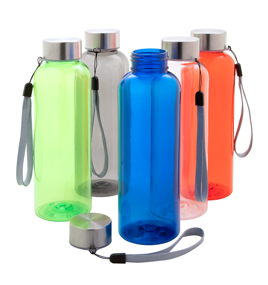 Sportovní láhev z plastu RPET bez BPA s víčkem z nerezové oceli a popruhem, 500 ml. Nevhodné pro sycené nápoje.