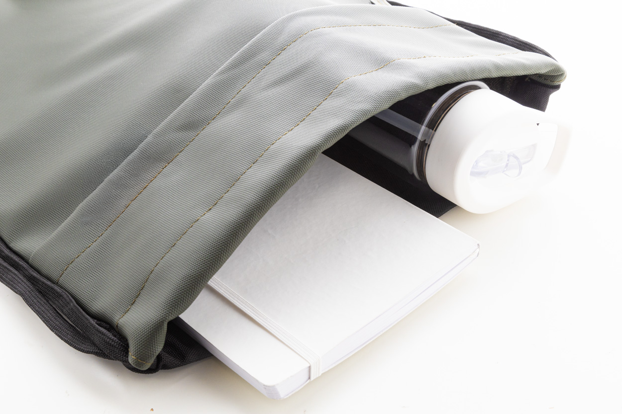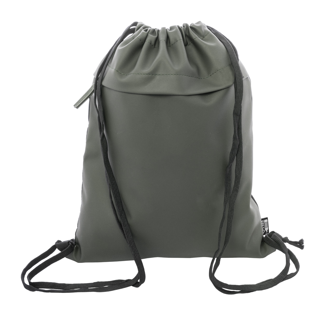 RPET vak se stahovací šňůrkou,s přední stranou potaženou PU a přední kapsou na zip. Polyester 600D RPET potažený PU s výrazným štítkem RPET.