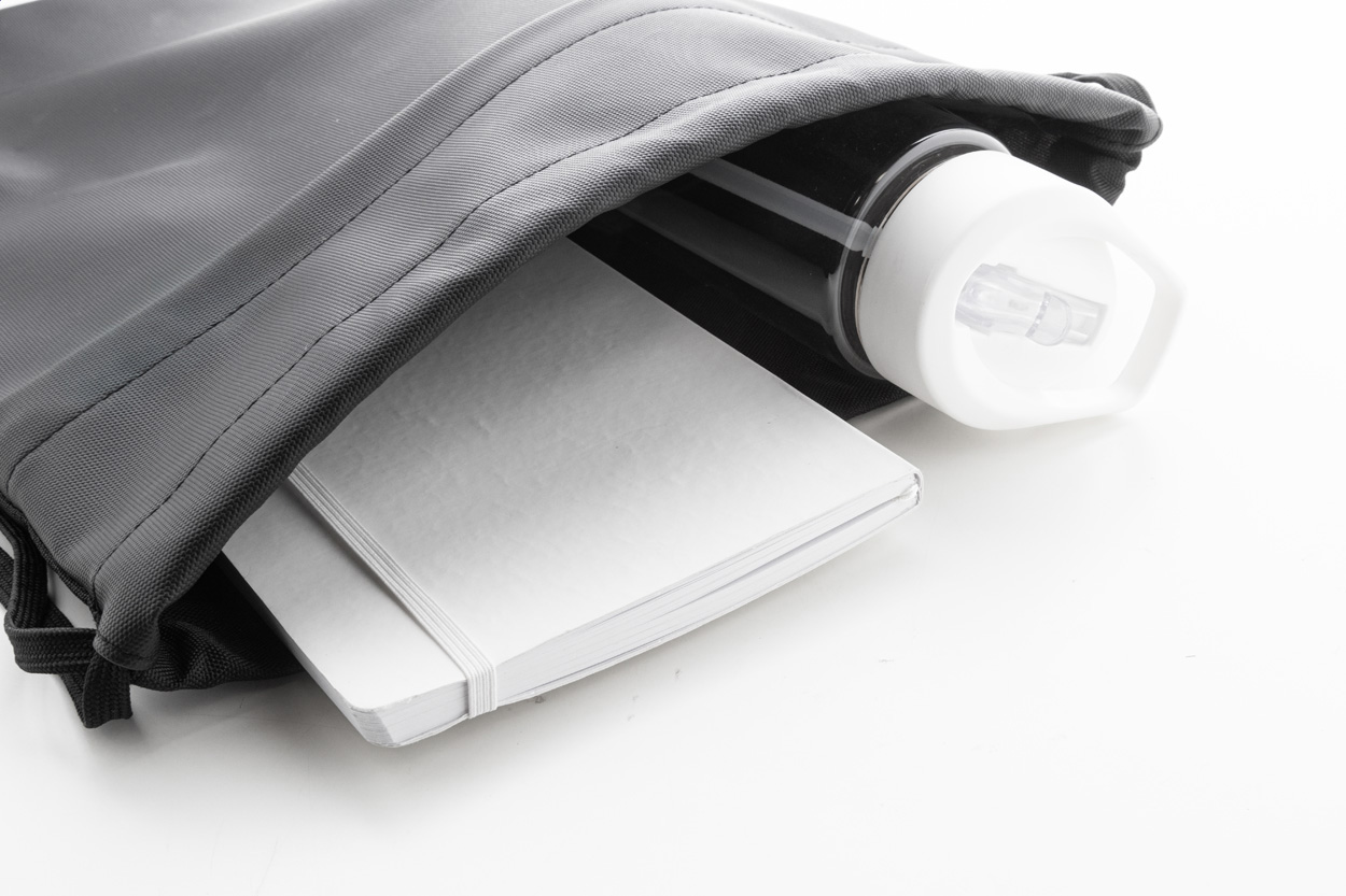 RPET vak se stahovací šňůrkou,s přední stranou potaženou PU a přední kapsou na zip. Polyester 600D RPET potažený PU s výrazným štítkem RPET.
