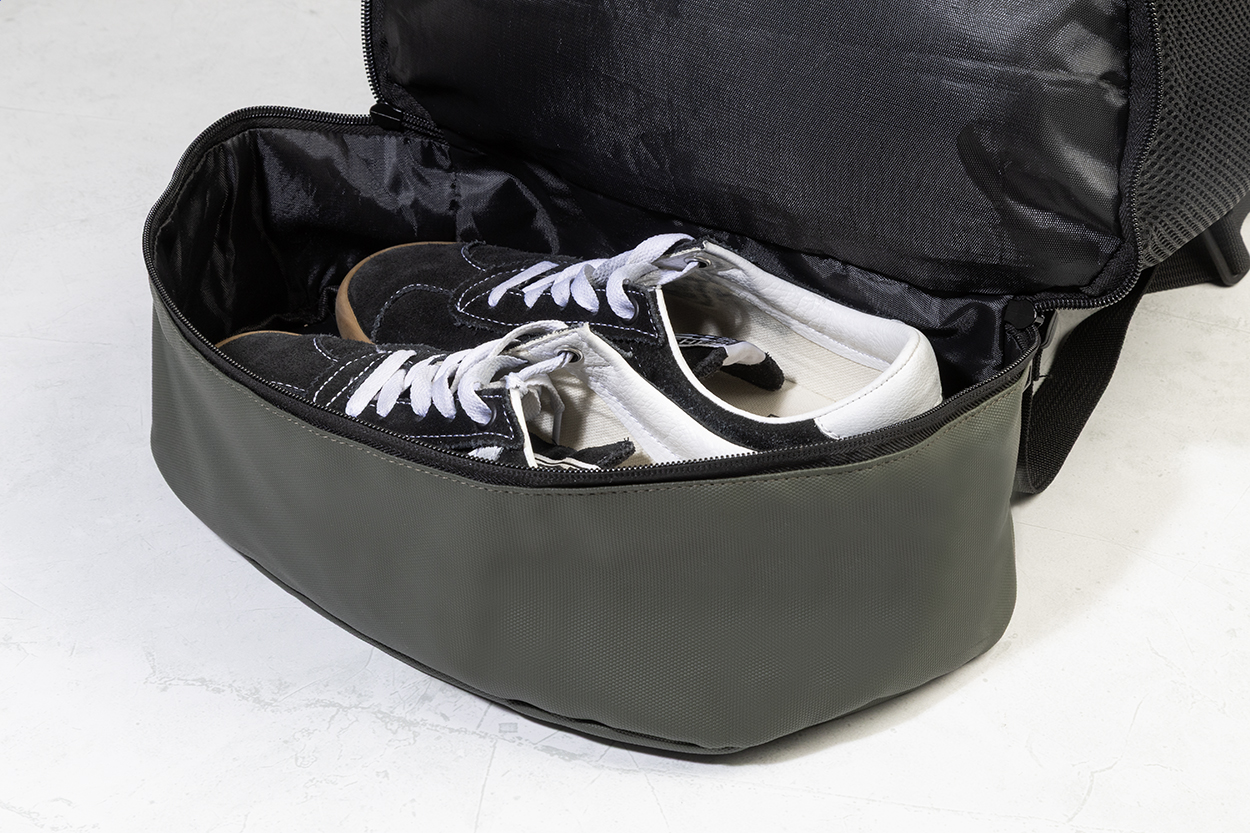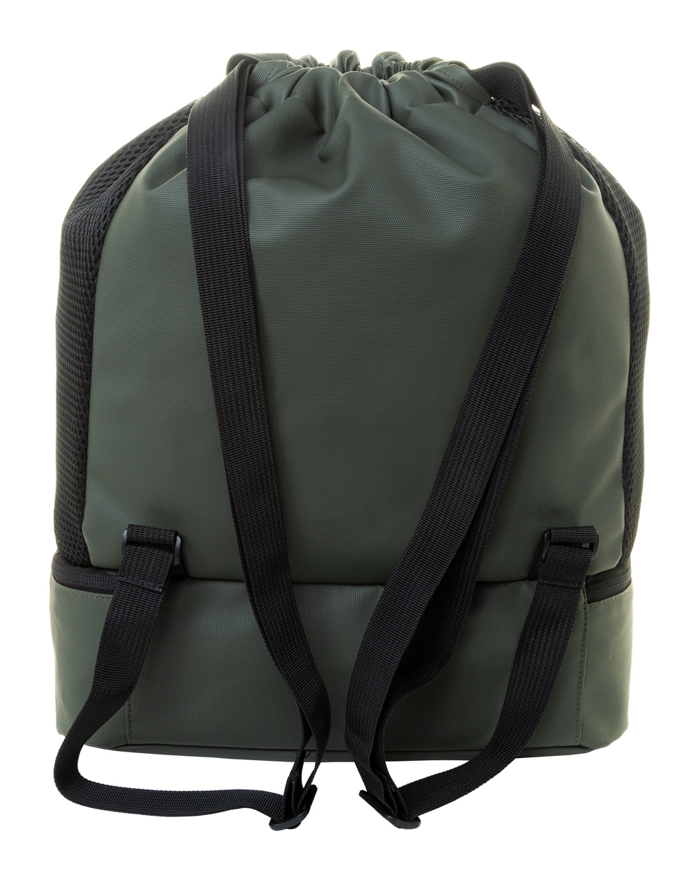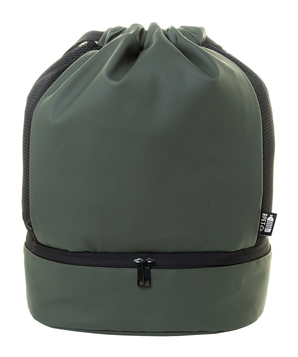 Prémiový vak se stahovací šňůrkou z RPET s přihrádkou na boty na zip, bočními vložkami ze síťoviny a širokými popruhy. Polyester 600D RPET potažený PU s výrazným štítkem RPET.