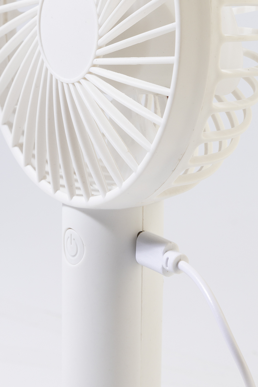 Elektrický ruční větráček z recyklovaného PP s držákem na mobilní telefon, stolním stojanem a vestavěnou dobíjecí baterií s USB portem (800 mAh). Se 3 rychlostmi. Včetně nabíjecího kabelu s USB portem.