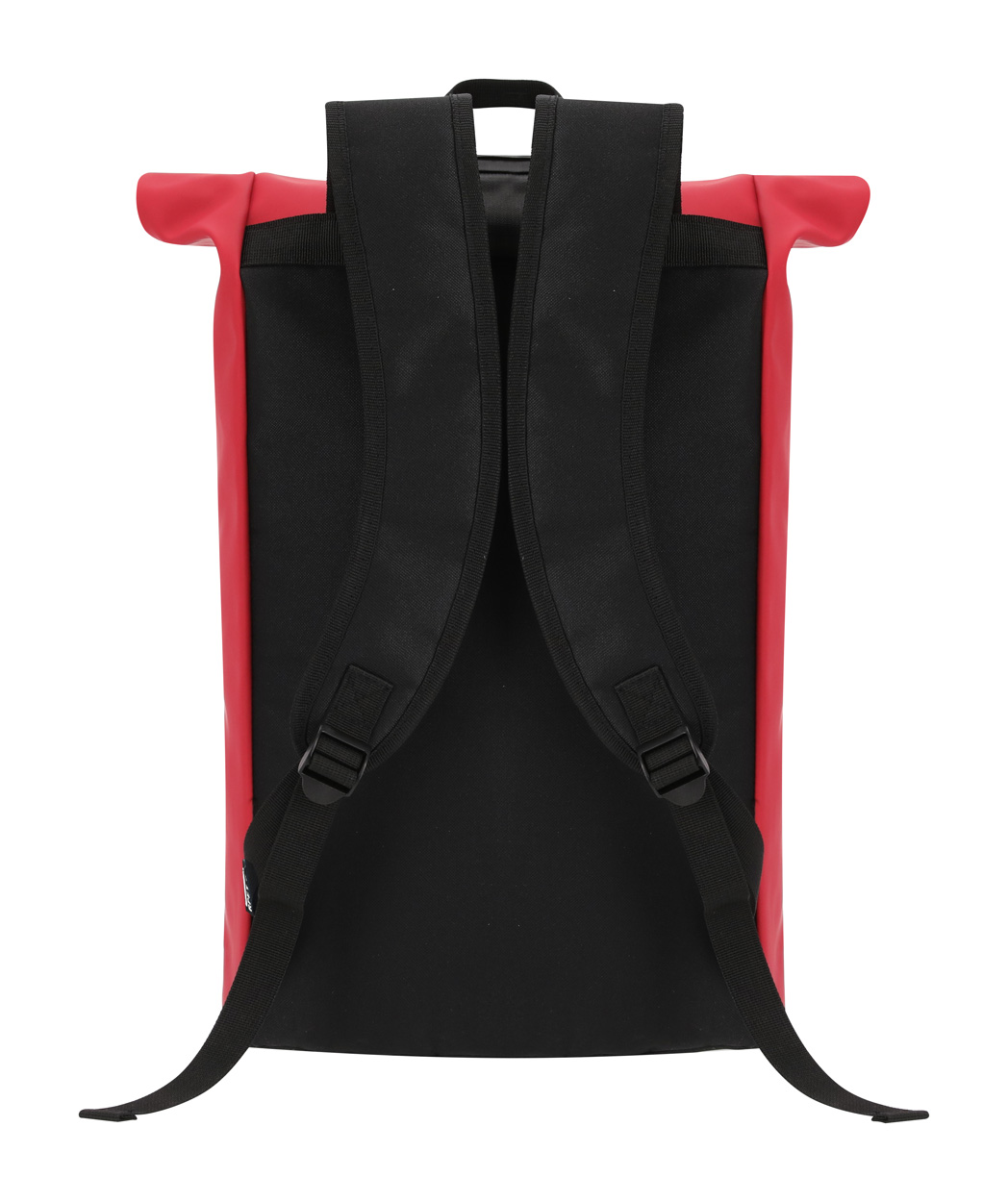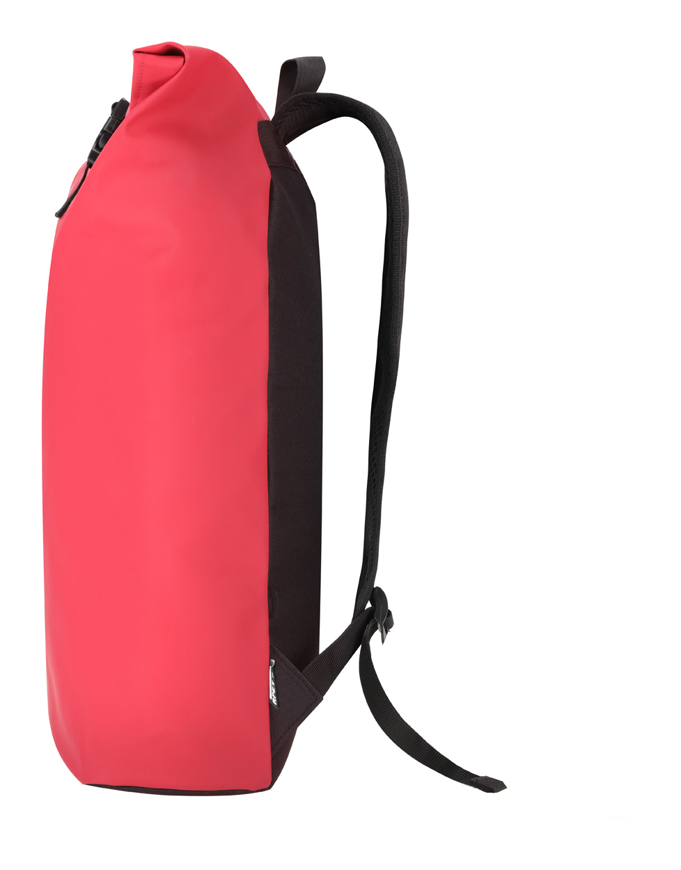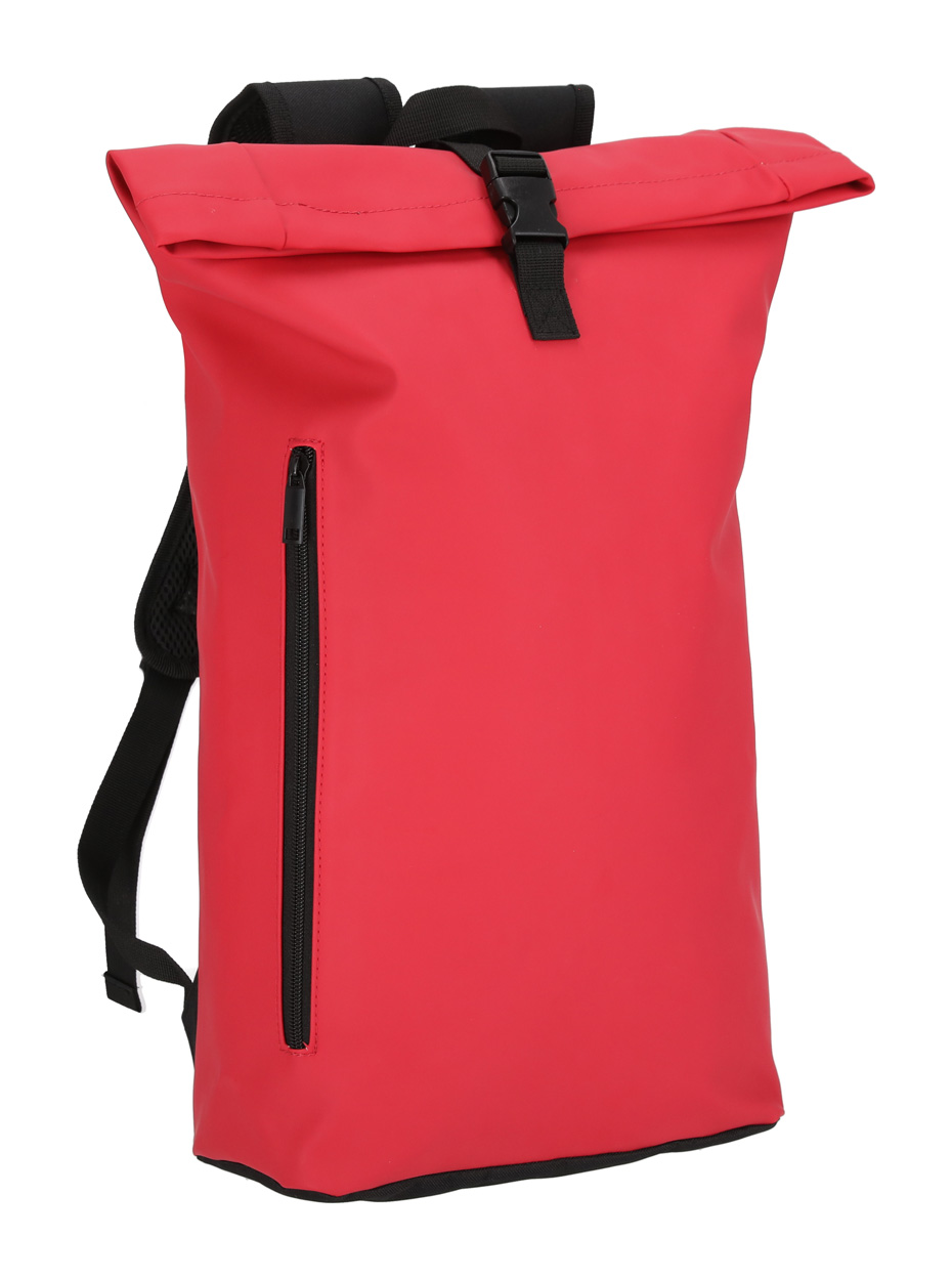 Vodotěsný, měkký rolovací batoh z recyklované PU kůže se zapínáním na přezku, přední kapsou na zip a polstrovanou přihrádkou na notebook (15"). S polstrovanými zády a ramenními popruhy. S výrazným recyklovaným PU štítkem.
