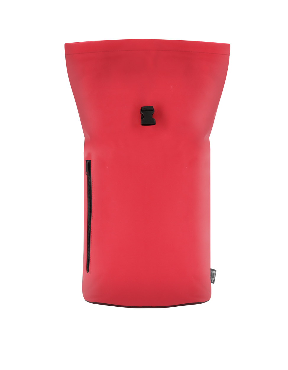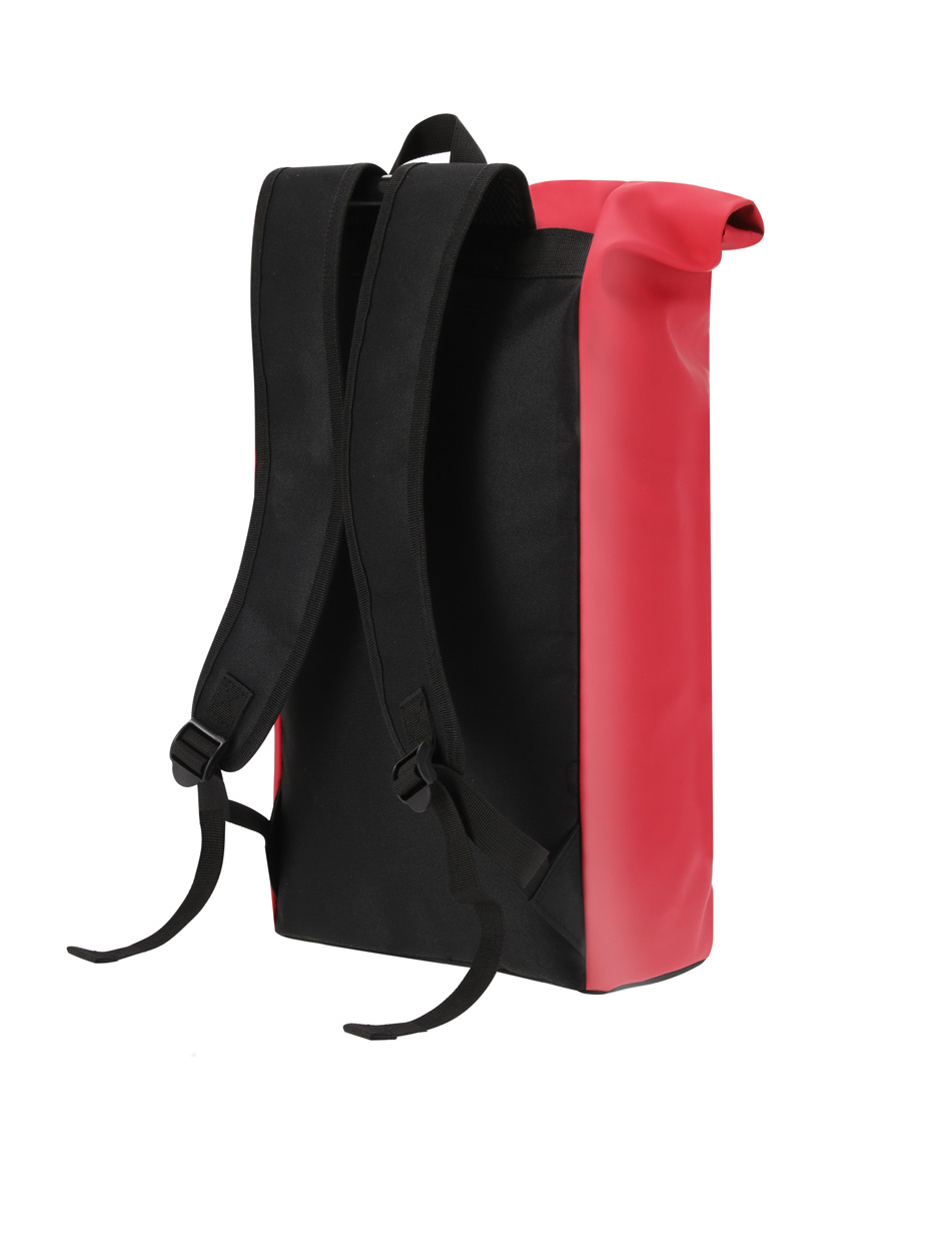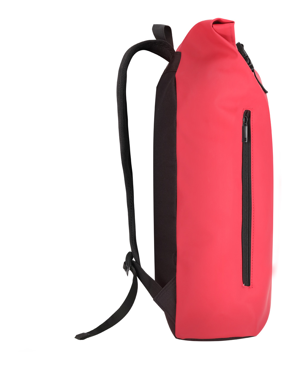 Vodotěsný, měkký rolovací batoh z recyklované PU kůže se zapínáním na přezku, přední kapsou na zip a polstrovanou přihrádkou na notebook (15"). S polstrovanými zády a ramenními popruhy. S výrazným recyklovaným PU štítkem.