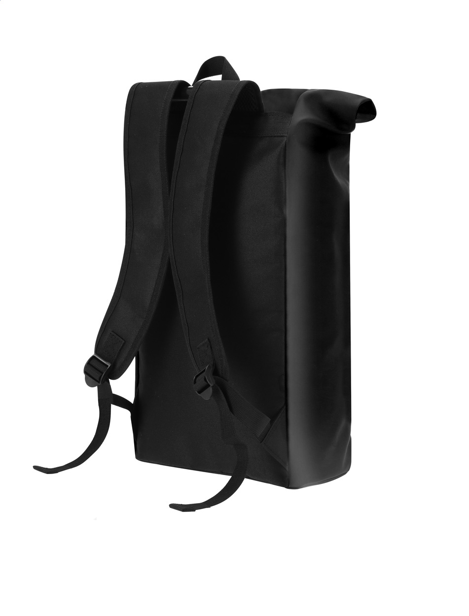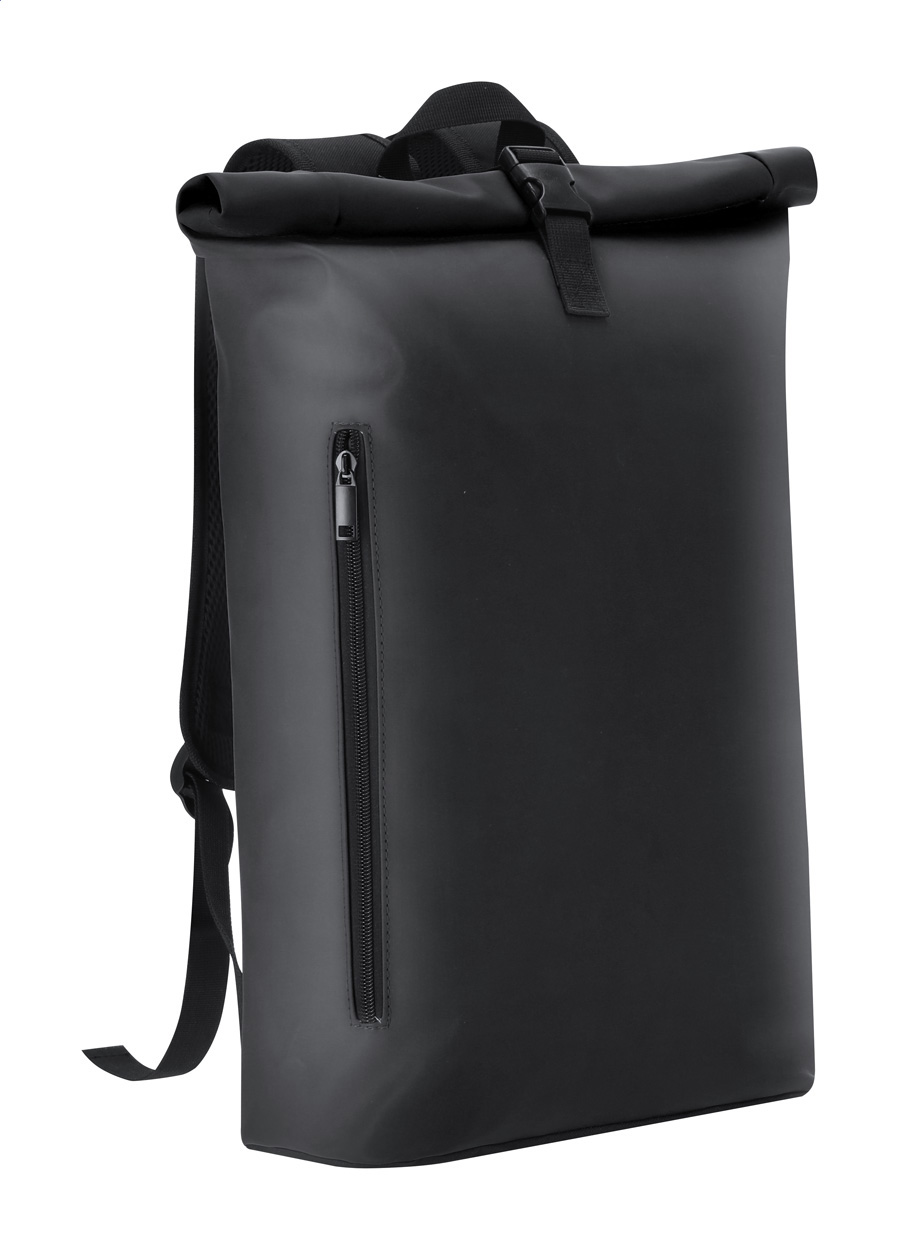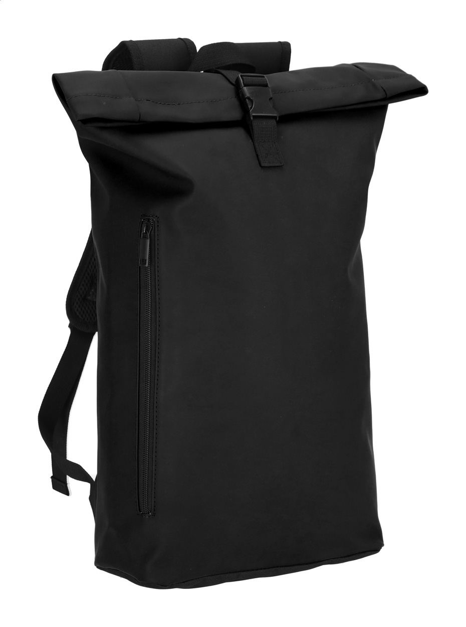 Vodotěsný, měkký rolovací batoh z recyklované PU kůže se zapínáním na přezku, přední kapsou na zip a polstrovanou přihrádkou na notebook (15"). S polstrovanými zády a ramenními popruhy. S výrazným recyklovaným PU štítkem.