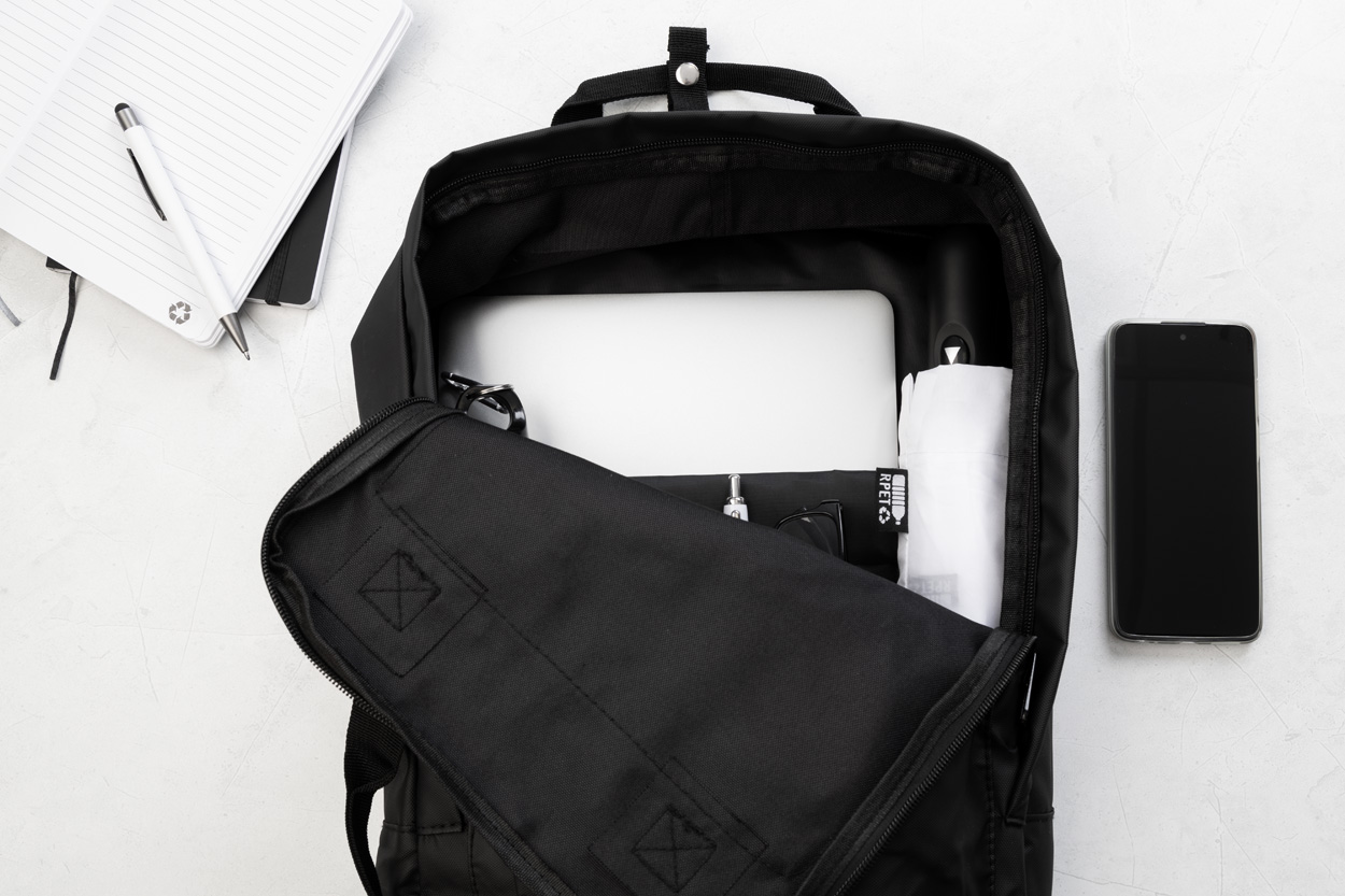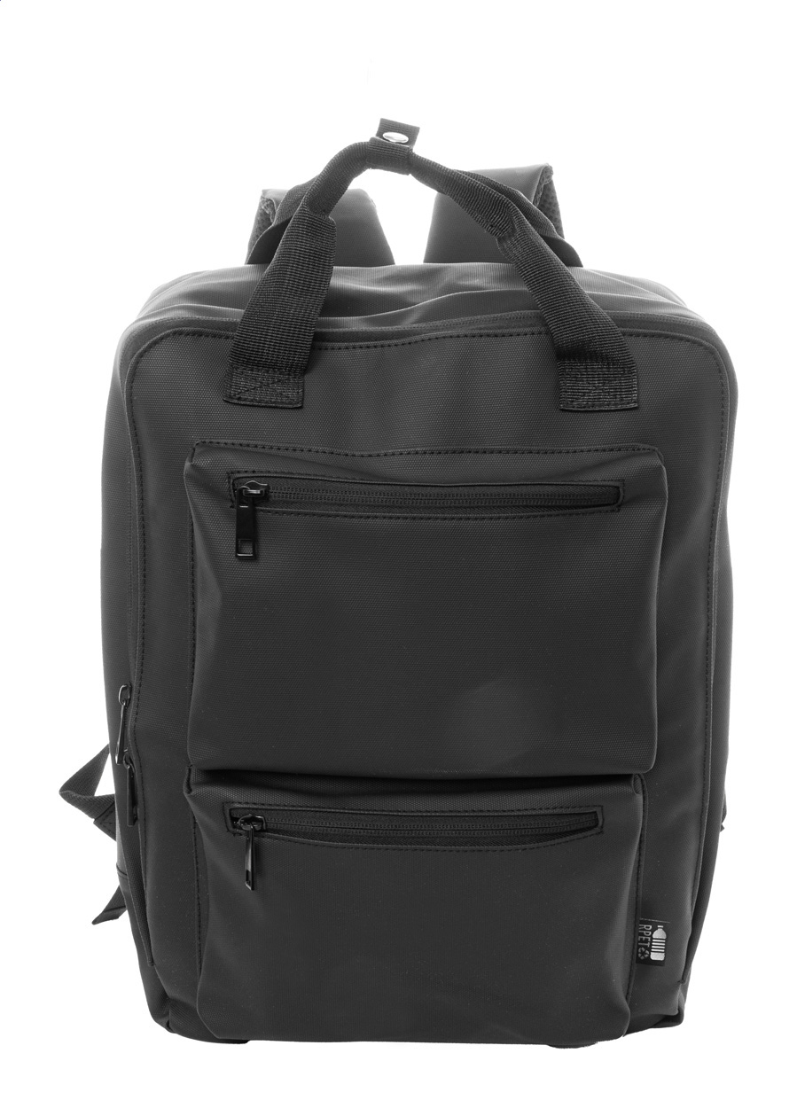 Vodotěsný, měkký batoh z recyklované PU kůže s hlavním oddílem na zip, 2 předními kapsami na zip, bočními kapsami a polstrovanou přihrádkou na notebook (15") a tablet (10") S polstrovanými zády a ramenními popruhy. S výrazným recyklovaným PU štítkem.