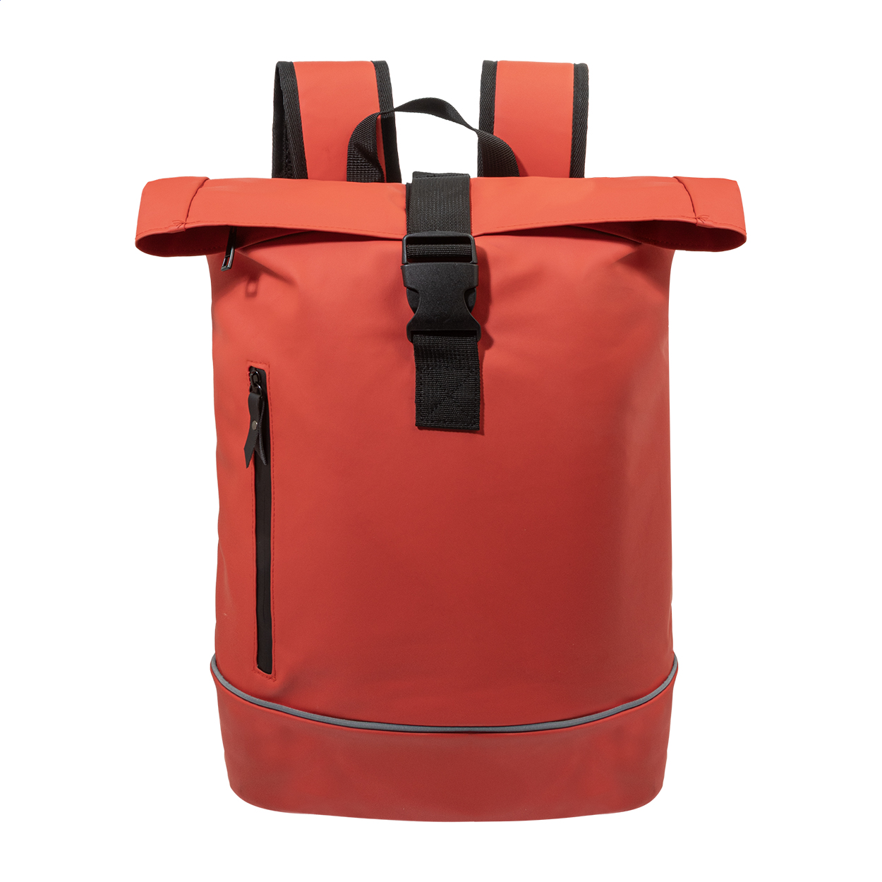 Voděodolný batoh s rolovacím vrškem z měkké recyklované PU kůže s hlavní přihrádkou na zip a zapínáním na přezku, přední kapsou s voděodolným zipem, polstrovanou přihrádkou na notebook (15") a reflexním proužkem. S polstrovanými zády a ramenními popruhy. S výraznou nálepkou z recyklované PU kůže. Pouze pro propagační účely, se produkt nekvalifikuje jako osobní ochranný prostředek.