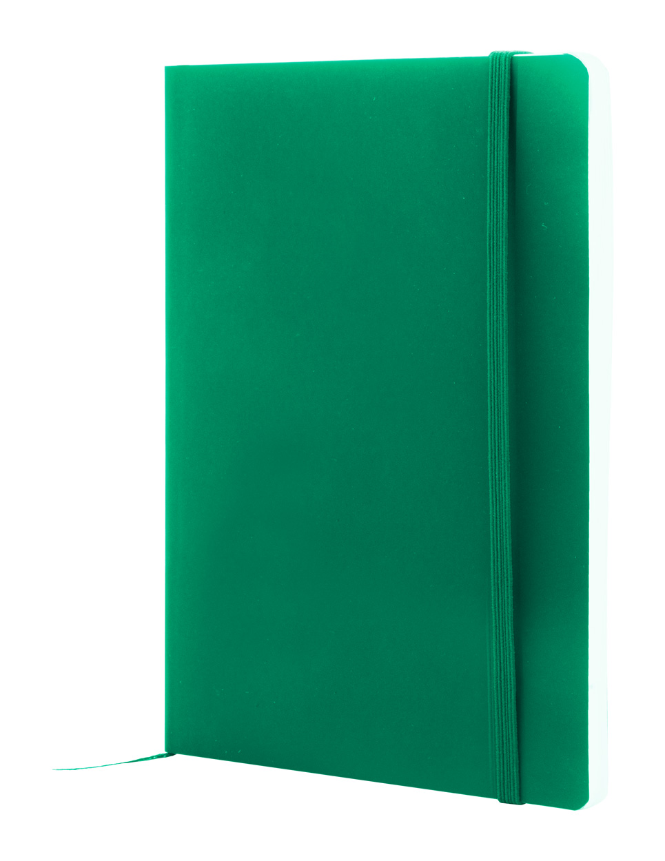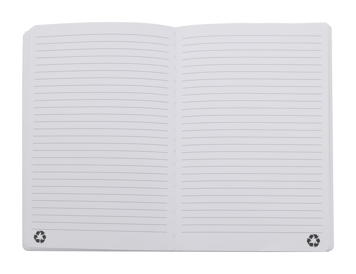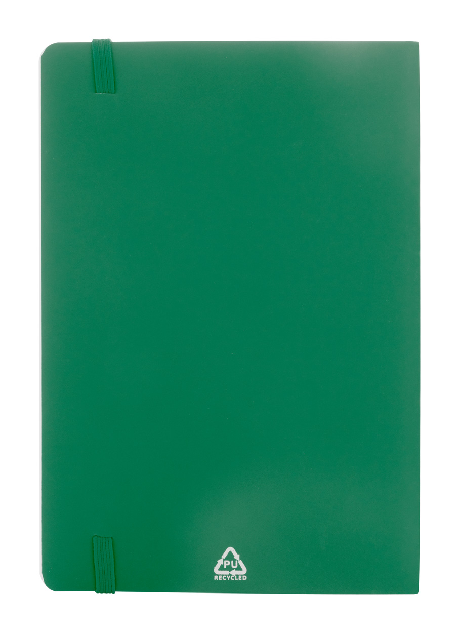 Blok A5 z recyklované PU kůže s měkkou vazbou s 80 linkovanými listy z recyklovaného papíru. Se záložkou v odpovídající barvě a gumičkou.