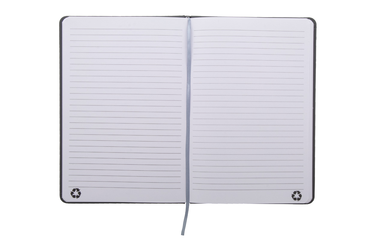 Blok potažený recyklovanou PU kůží se 100 linkovanými listy z recyklovaného papíru. Se záložkou v odpovídající barvě a gumičkou. Velikost A5.