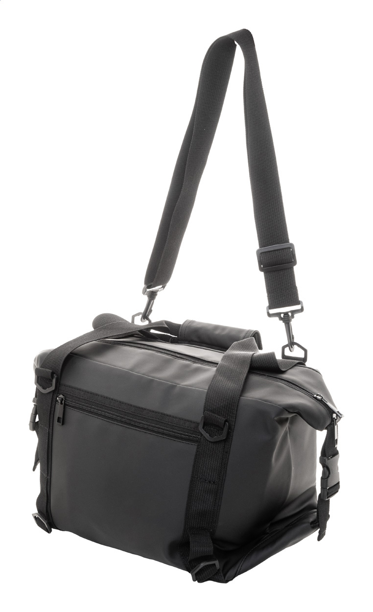 Skládací chladící taška na zip z měkké recyklované PU kůže s hliníkovou výplní a přední kapsou na zip. S bočními přezkami, držadly a nastavitelným ramenním popruhem. Tašku lze složit naplocho pro snadné skladování nebo ji během používání zajistit pomocí bočních výztuh.