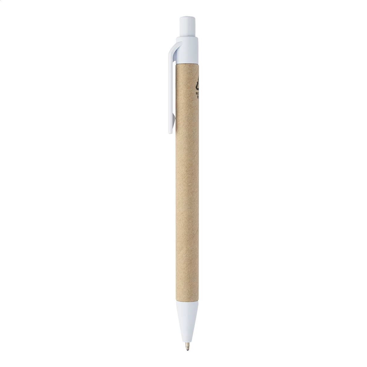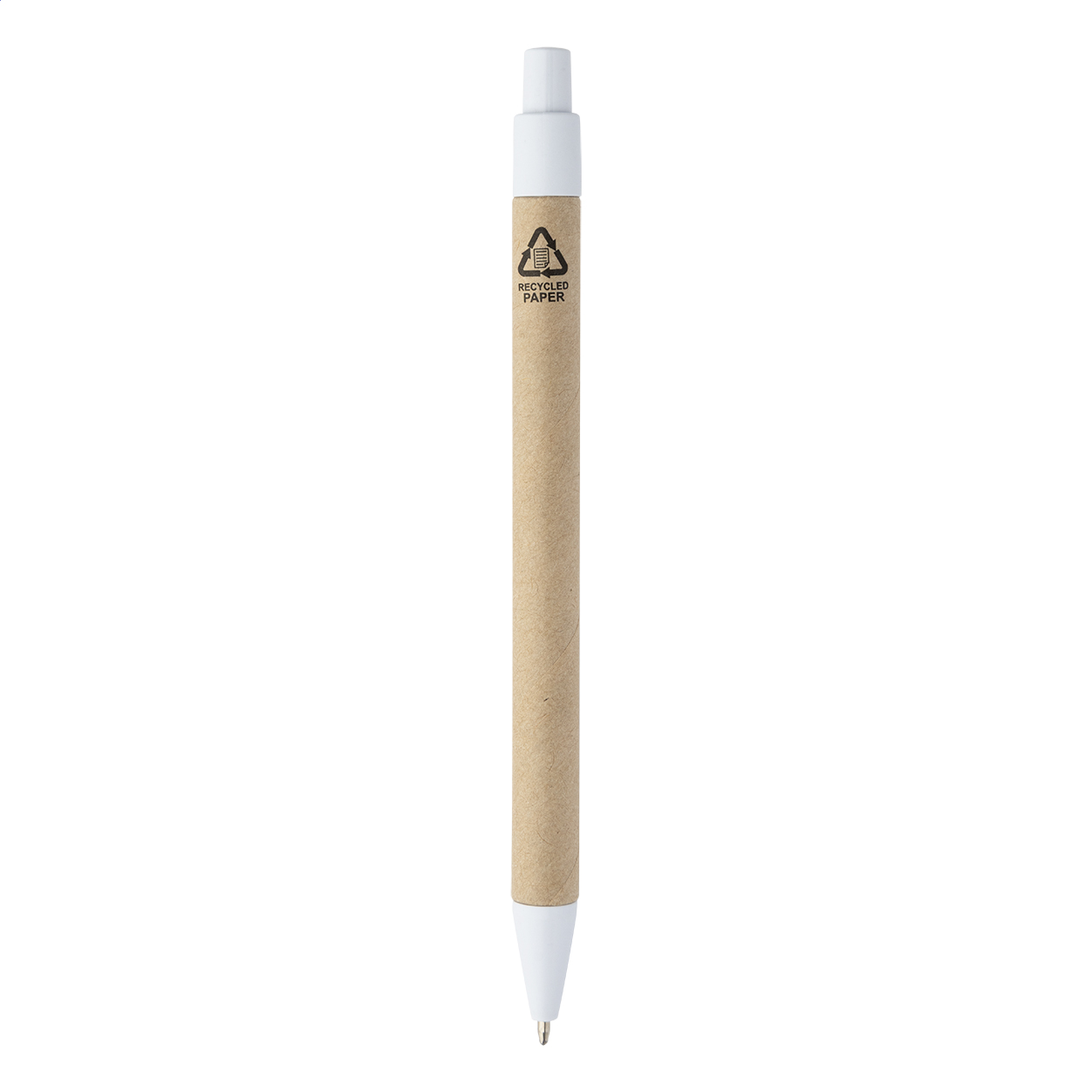 Blok s recyklovanou PU kůží, 70 linkovanými listy z recyklovaného papíru a 125 značkovači stránek (v 5 různých barvách). Včetně recyklovaného papíru a kuličkového pera z recyklovaného PP s modrou náplní.