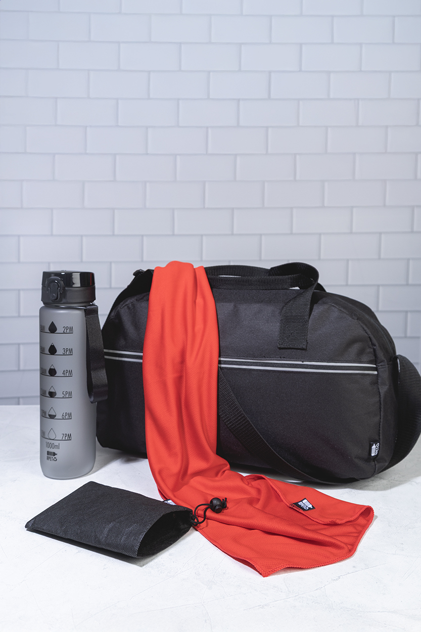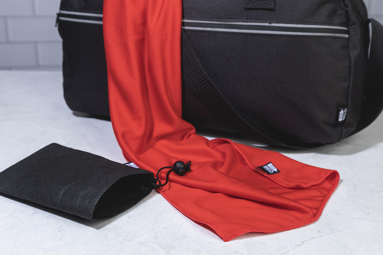 Sportovní ručník z mikrovlákna RPET v přepravním pouzdře z netkané tkaniny RPET s charakteristickou etiketou RPET. Polyester RPET, 140 g/m².