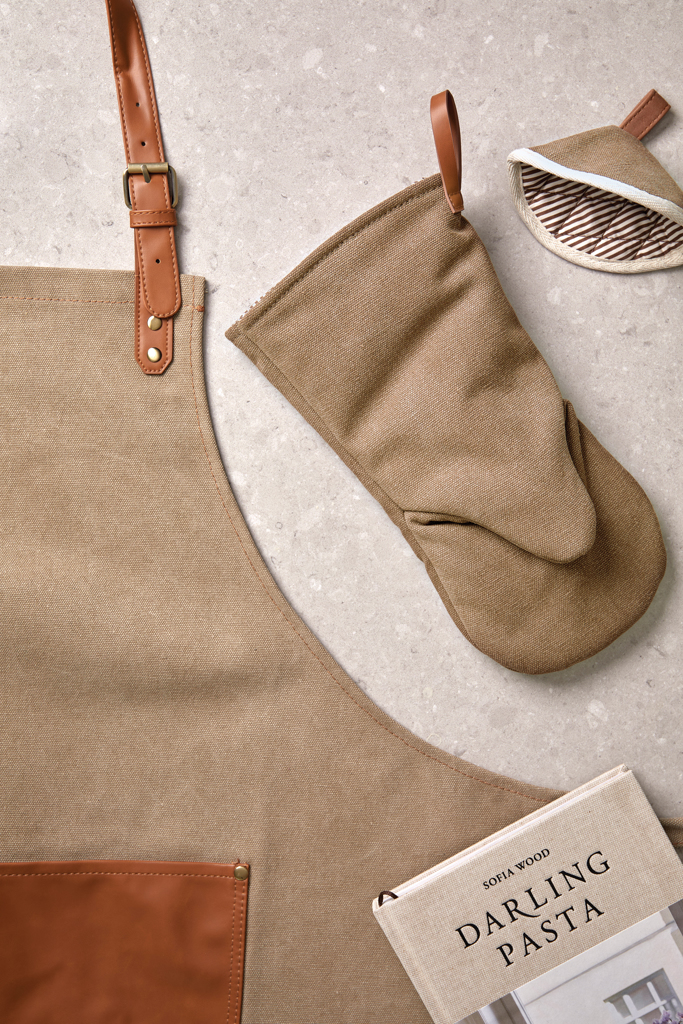 Praktické a stylové rukavice do trouby z bavlněného plátna. Bohatě polstrované, aby chránily vaše ruce při přenášení horkých pokrmů z kuchyně na stůl. Když stylovou rukavici zrovna nepoužíváte, pomocí praktického koženého poutku ji jednoduše pověsíte, aby byla vždy po ruce. Vhodná pro praváky i leváky.