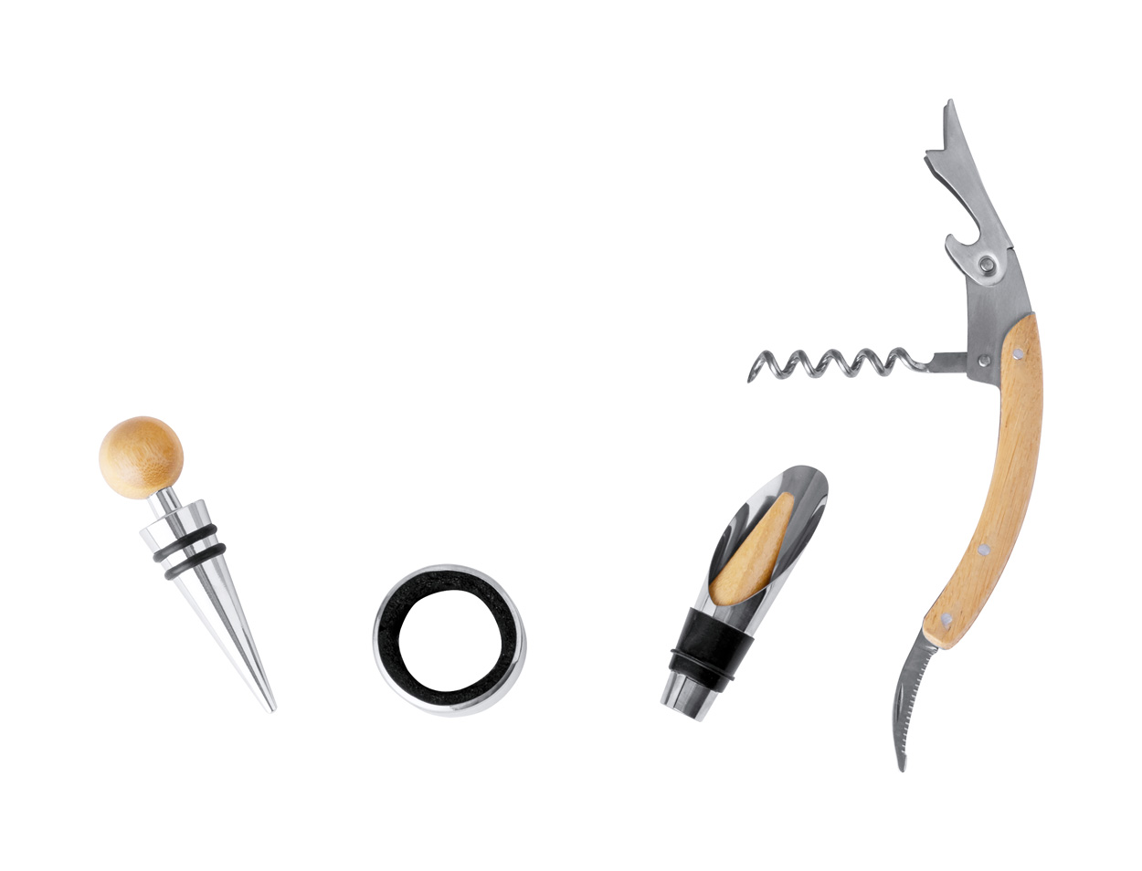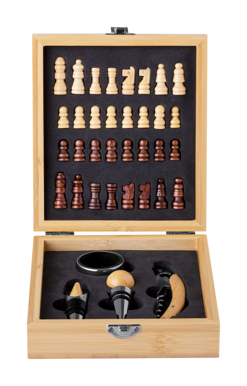 4dílná sada na víno z nerezové oceli s bambusovou vložkou v bambusové krabičce se šachovnicí a 32 šachovými figurkami. Součástí jsou vývrtka, zátka, kroužek a řezák.