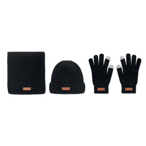 Sada 3 kusů zimních doplňků. Obsahuje čepici, šálu a hmatové rukavice se štítkem pro potisk. Vyrobeno z RPET.