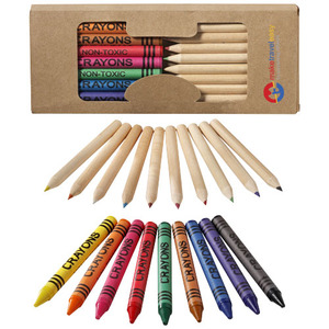 9 barevných voskových pastelek a 10 barevných pastelek v lepenkové krabičce s plastovým okénkem. Reklamní potisk nelze provést na komponentech.