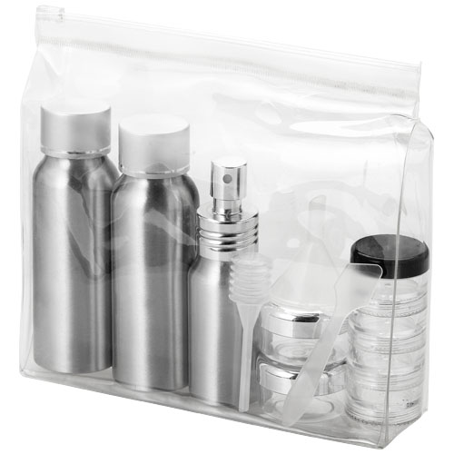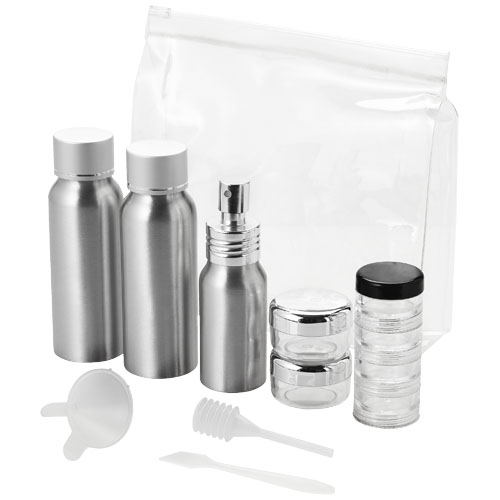Obsahuje dvě hliníkové lahvičky 80 ml, jeden hliníkový rozprašovač 30 ml, dvě nádobky 0,5 uncí, jednu čtyřvrstvou nádobku, nálevku, stěrku a dudlík. Lahvičky, nálevka atd. jsou baleny v sáčku, nikoli v pouzdře. Reklamní potisk nelze provést na komponentech.