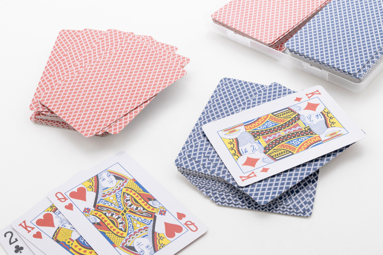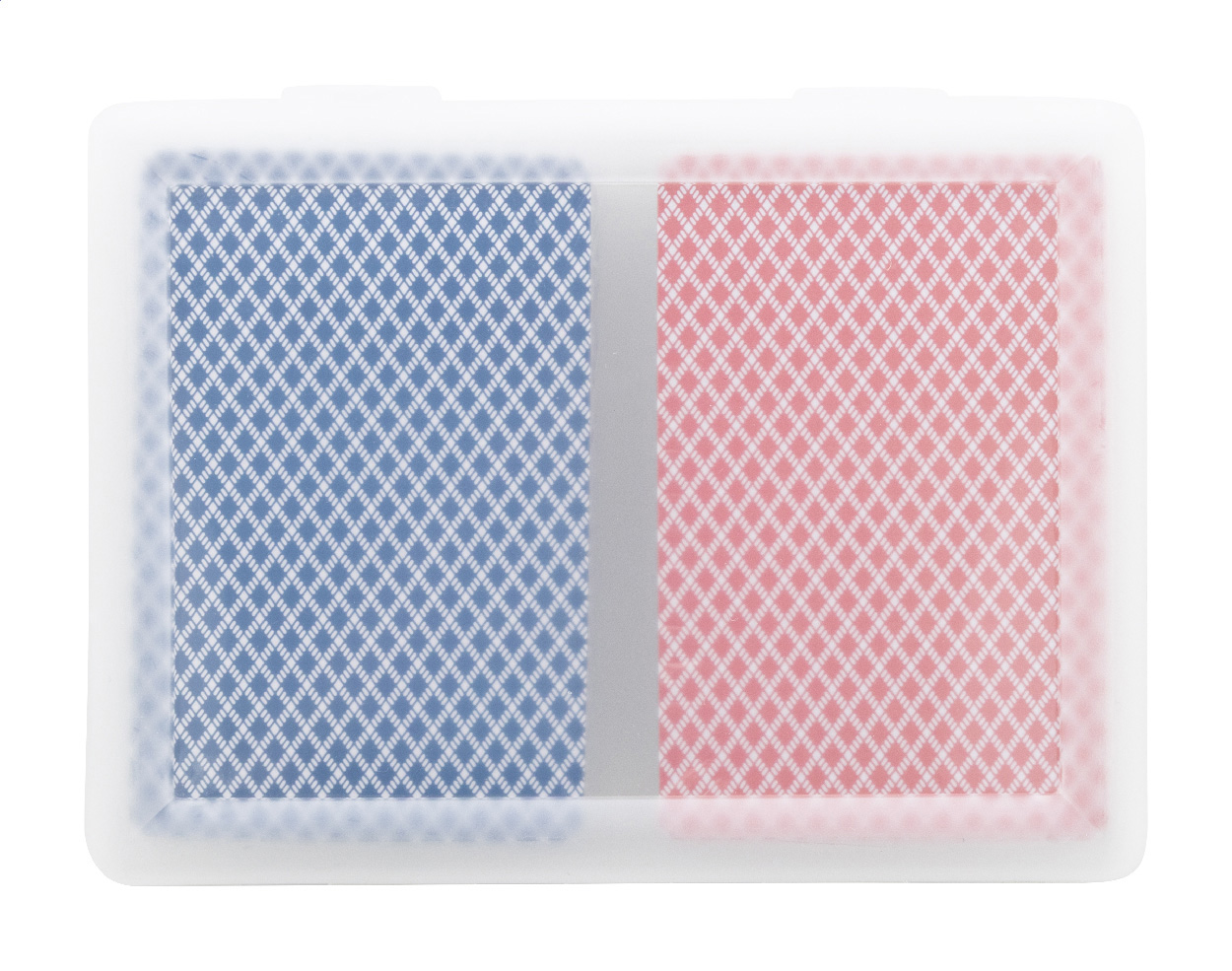 Sada papírových francouzských hracích karet v krabičce z recyklovaného PP. Obsahuje dva standardní balíčky po 54 kartách s červenou a modrou zadní stranou.