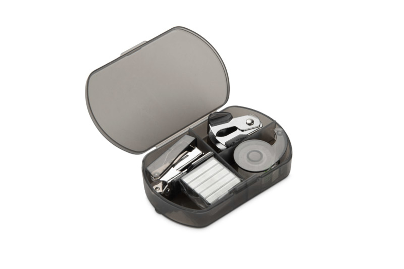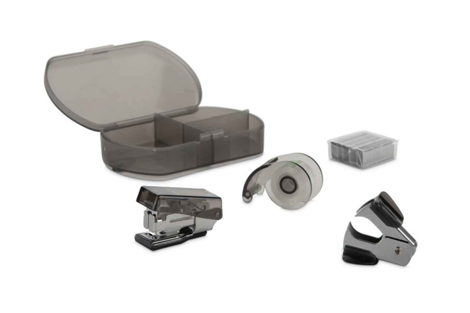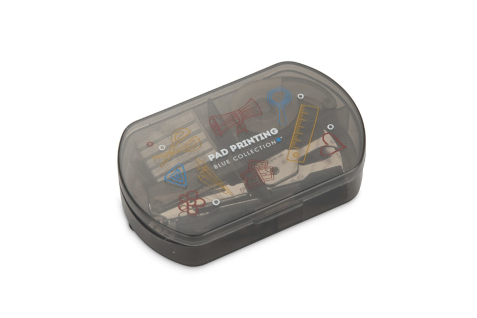 Kancelářská sada DOCSY je kompaktní řešení obsahující nejnutnější příslušenství: mini sešívačku, mini děrovačku, lepicí pásku a zásobu sponek - vše v praktickém plastovém kufříku. Ideální pro použití v terénu, na malém pracovním stole nebo jako praktická propagační pomůcka pro kancelářský a vzdělávací sektor.