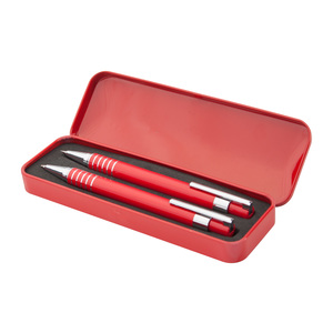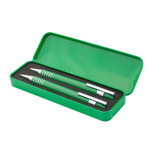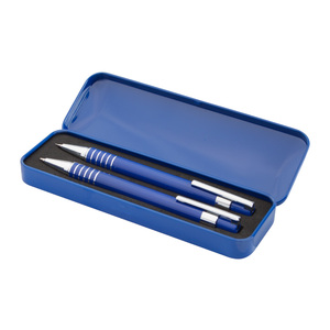Hliníkové kuličkové pero s modrou náplní a mechanická tužka s 0,7 mm tuhou v kovové krabičce.