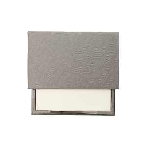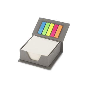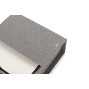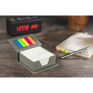 Praktické kostky s poznámkami pro váš stůl vyrobené z šedého papíru s kostkovanou texturou. Kostky se skládají z 300 poznámek. Uvnitř víka jsou samolepící poznámky ve 5 barvách.