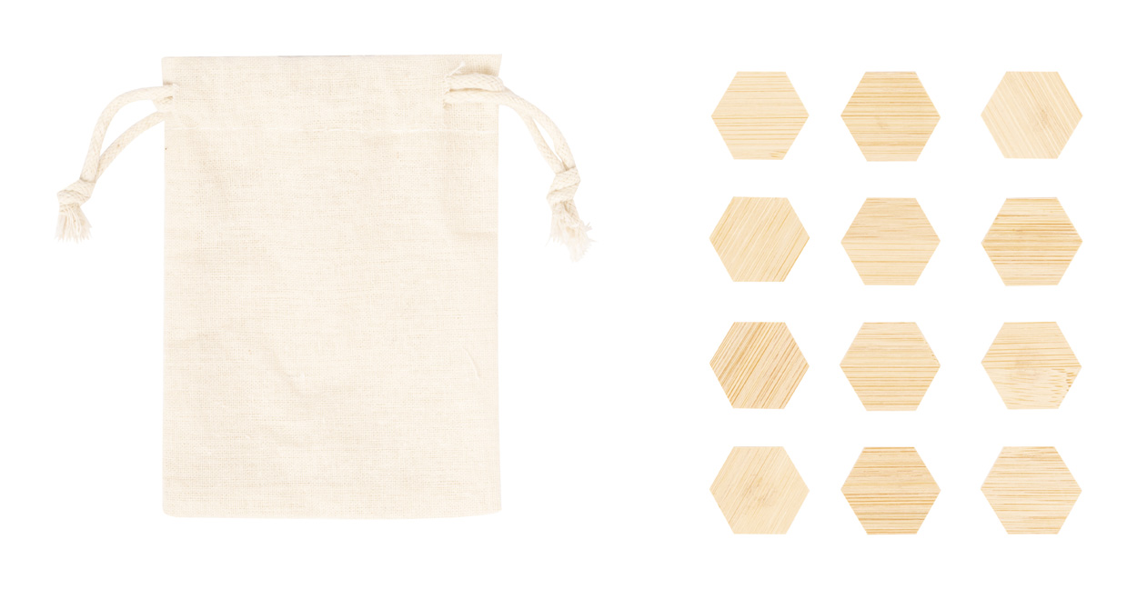 12dílná sada bambusových magnetů na ledničku, v bavlněném pytlíku se stahovací šňůrkou.