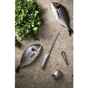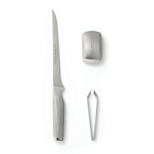Filetovací nůž z vysoce kvalitní japonské oceli 420J. Filetovací nůž má dlouhou, tenkou a pružnou čepel – ideální pro přesné řezání. Používá se například k filetování ryb nebo porcování šunky. Součástí sady je kovové mýdlo, které odstraňuje pachy, například od ryb a česneku. Součástí balení je také pinzeta na odstraňování malých kostí z ryb. Ideální dárek pro milovníky vaření.