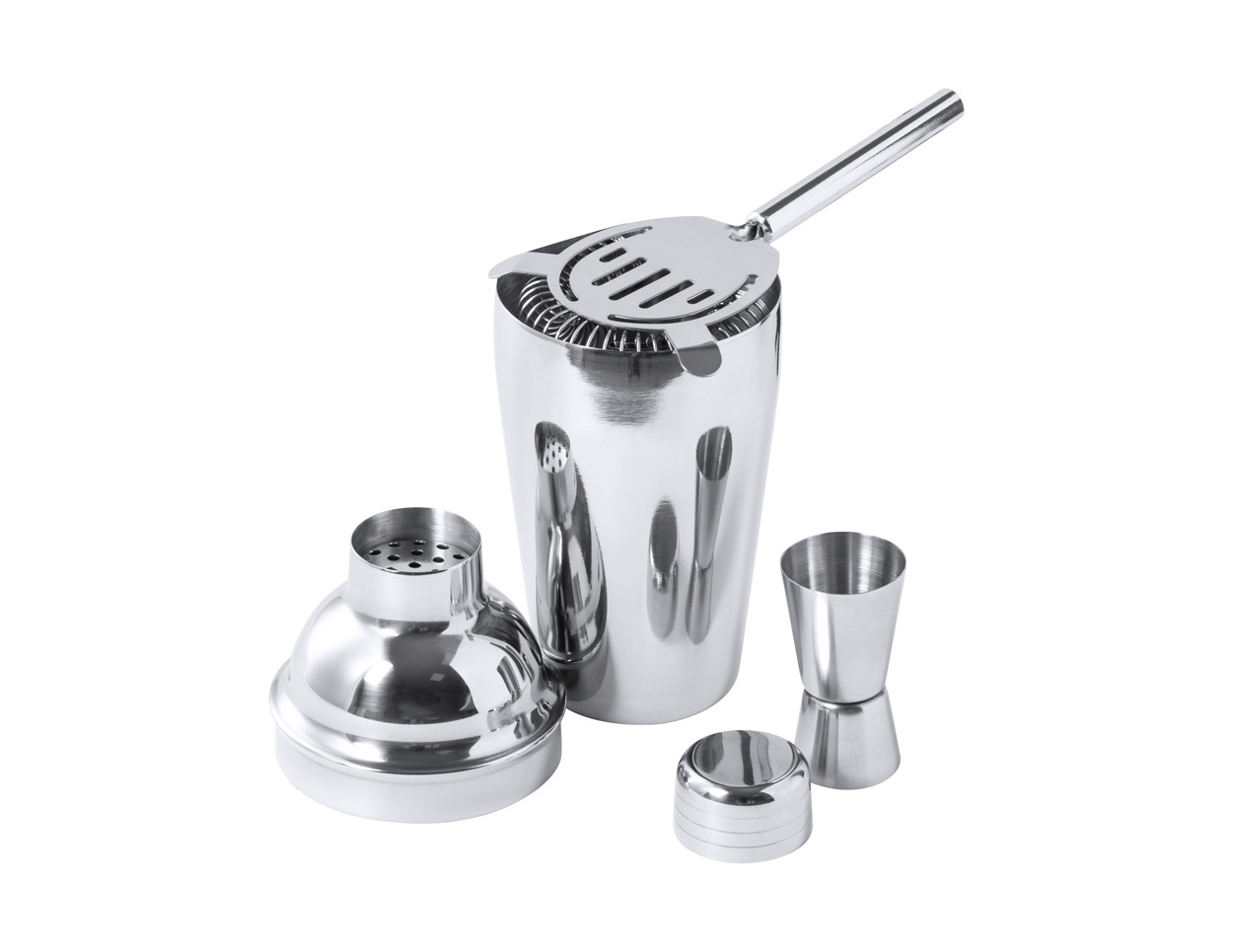 Nerezová koktejlová sada s 550 ml šejkrem, odměrkou a koktejlovým sítkem.