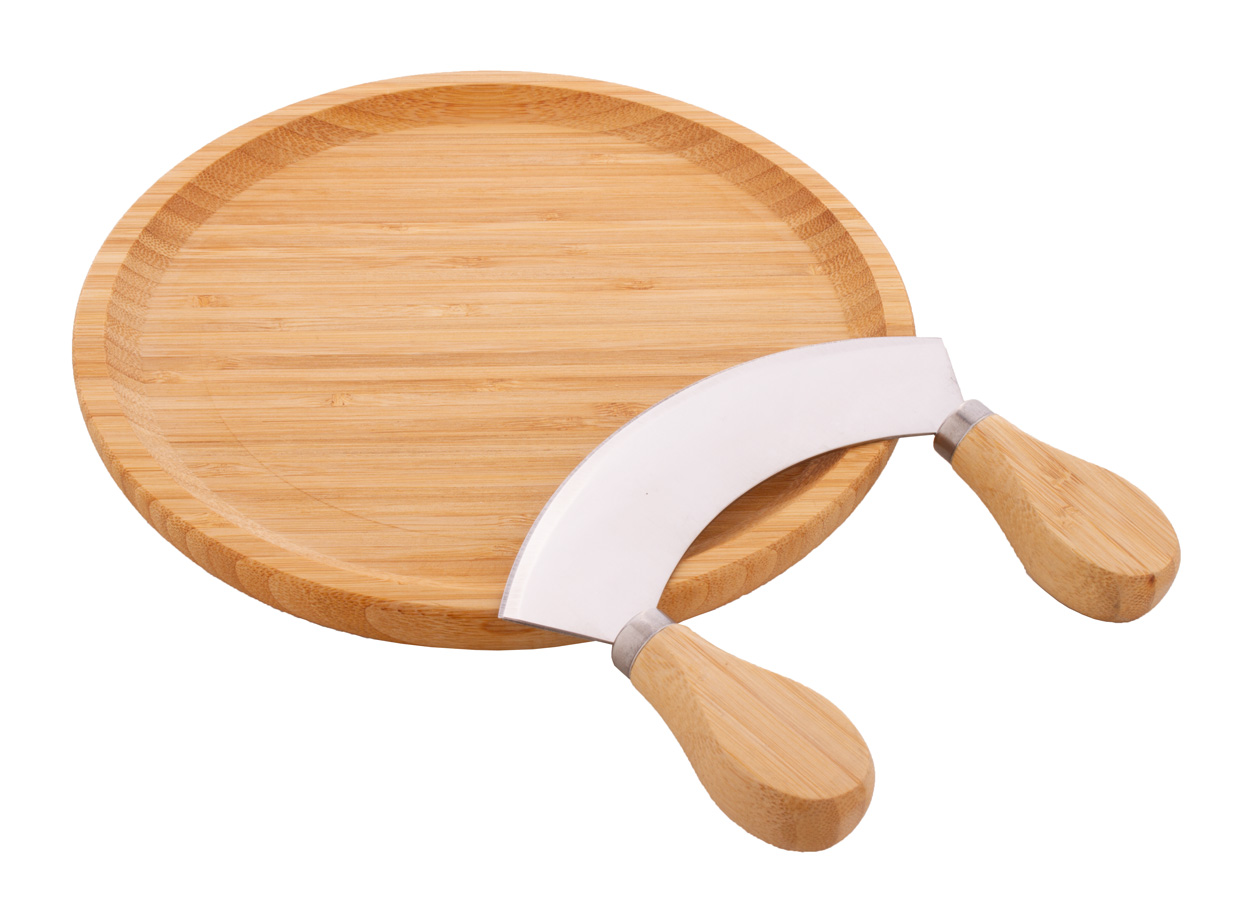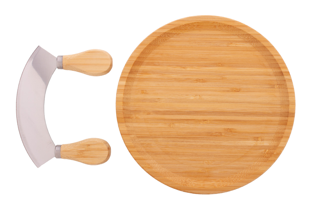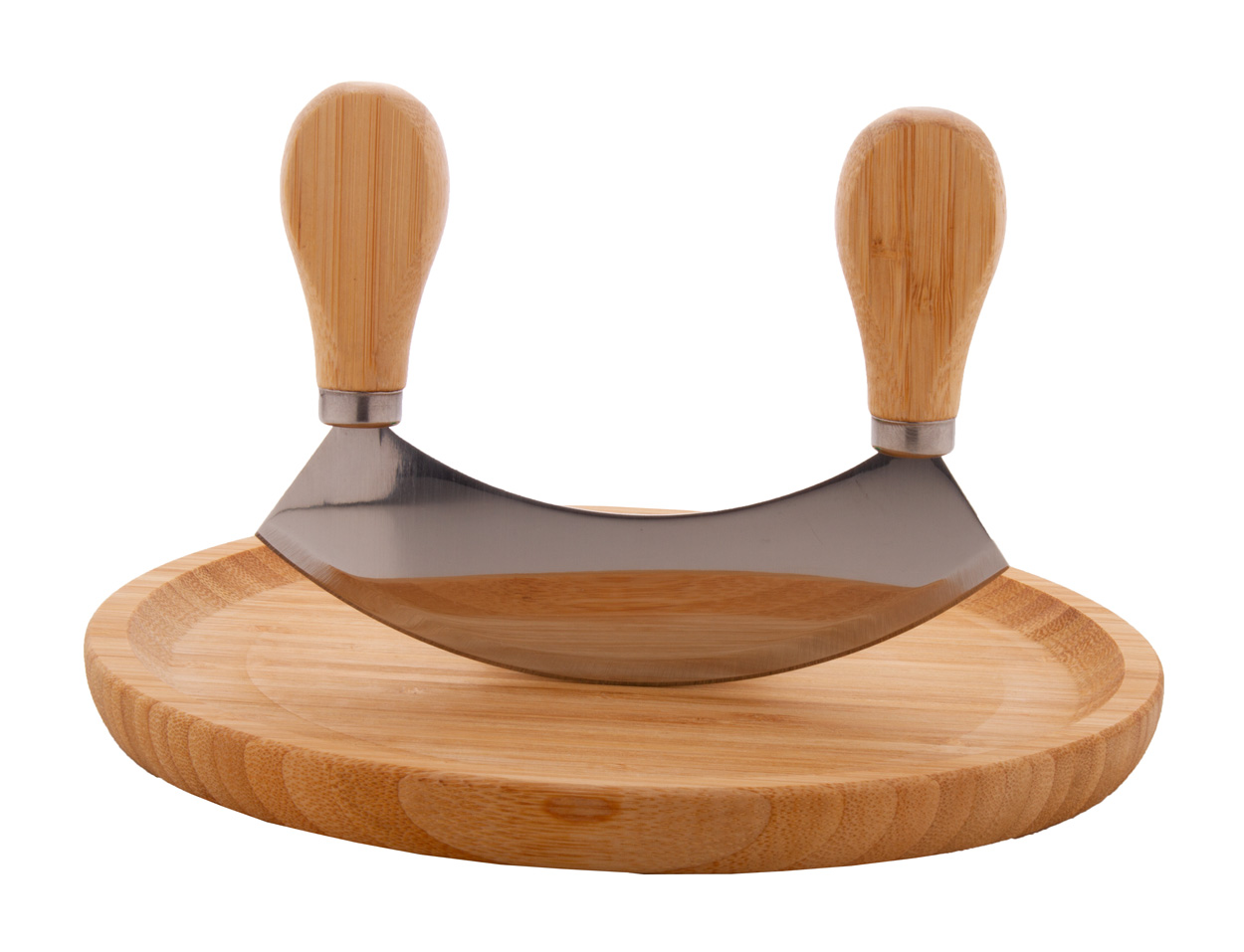 Sada z bambusu na krájení bylin, včetně kulatého bambusového prkénka a nerezového kráječe na bylinky s bambusovými rukojeťmi.