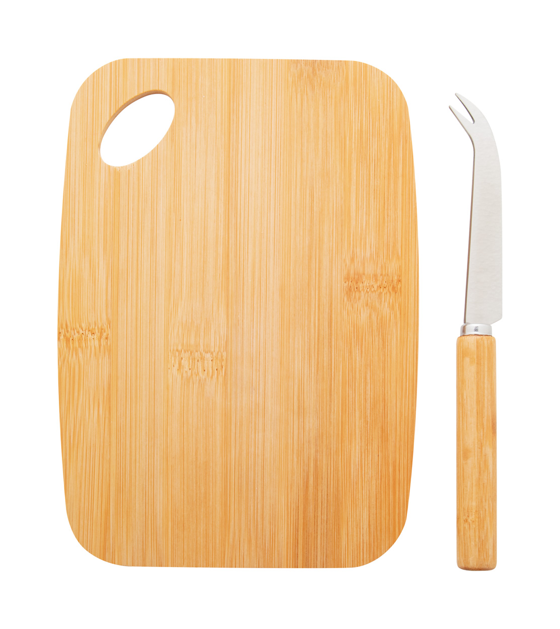 Sada na sýr s nožem z nerezové oceli a bambusovým prkénkem. V kraftové papírové krabici.