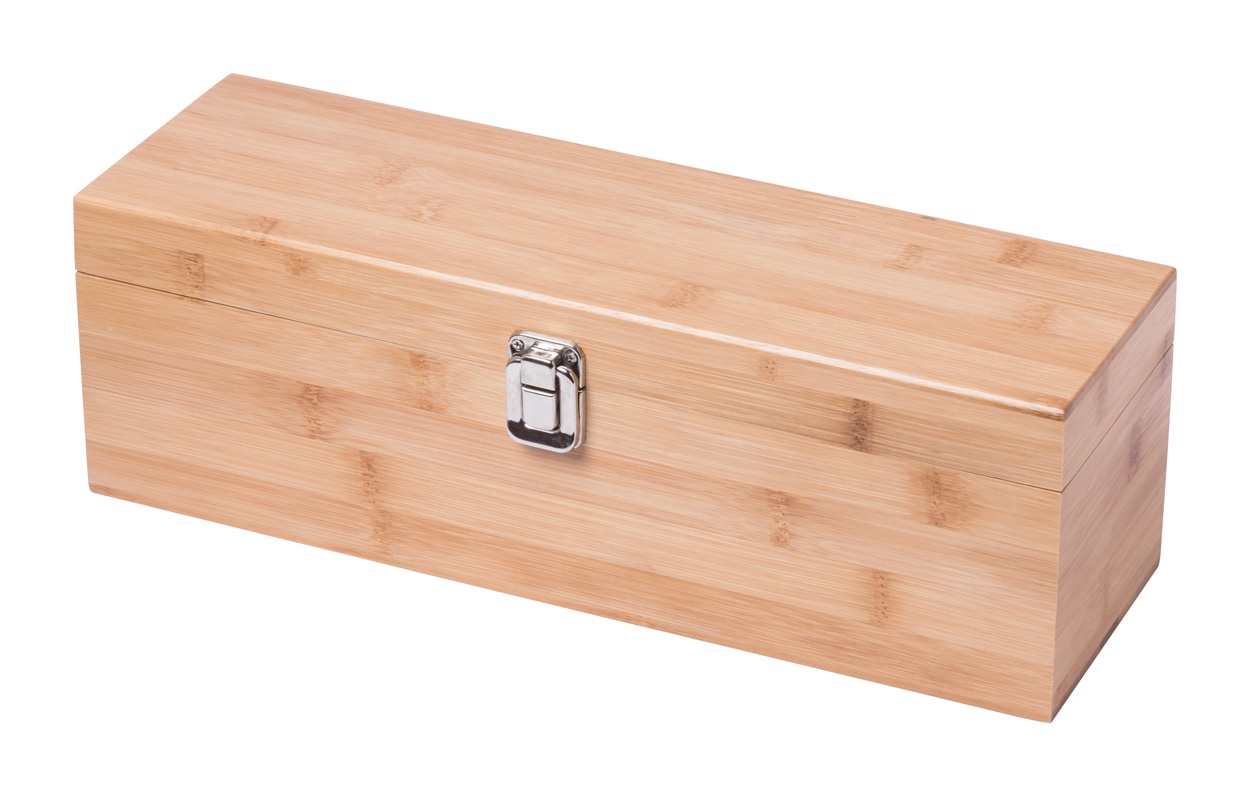 Sada na víno z bambusu s vývrtkou, kroužkem, nálevku a zátkou v bambusové krabičce s přihrádkou na láhev vína. Dodáváno bez láhve.