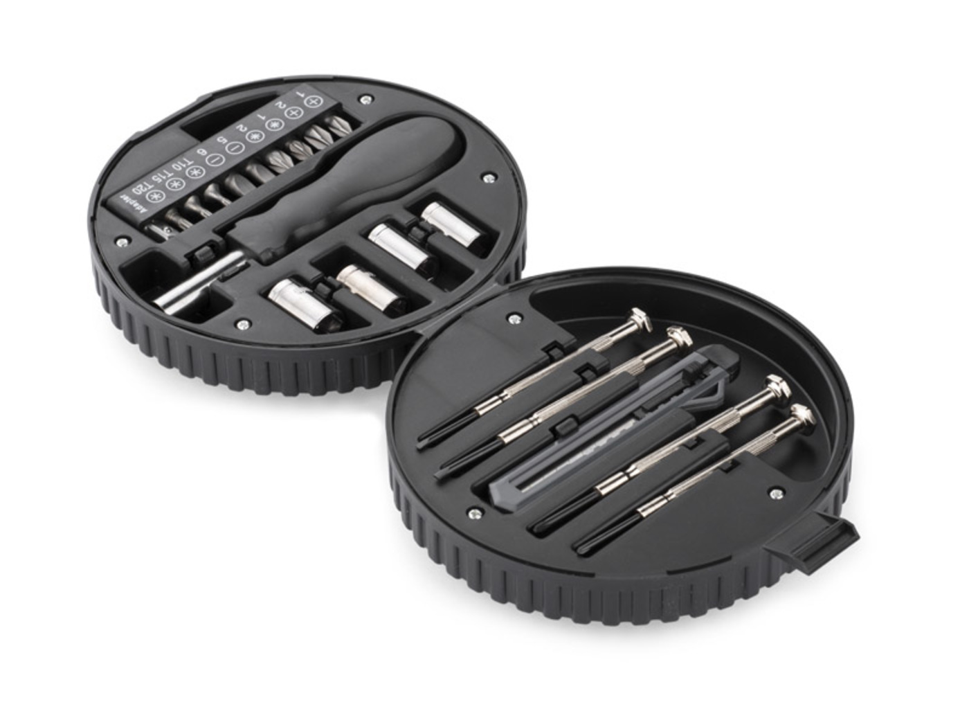 WHEEL je sada s mnoha užitečnými nástroji: čtyři přesné šroubováky, nůž na tapety, rukojeť, čtyři nástrčné klíče s adaptérem a devět bitů. Všechno je uzavřeno v charakteristickém případě ve tvaru kola automobilu.