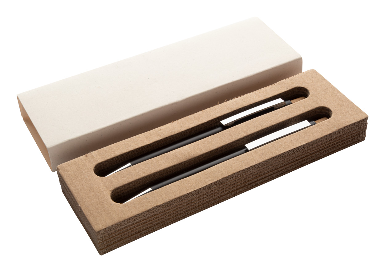 Sada pera z recyklovaného hliníku s kuličkovým perem a mechanickou tužkou s bambusovými knoflíky. S modrou náplní a 0,7 mm tuhy. V kraftové papírové krabici.