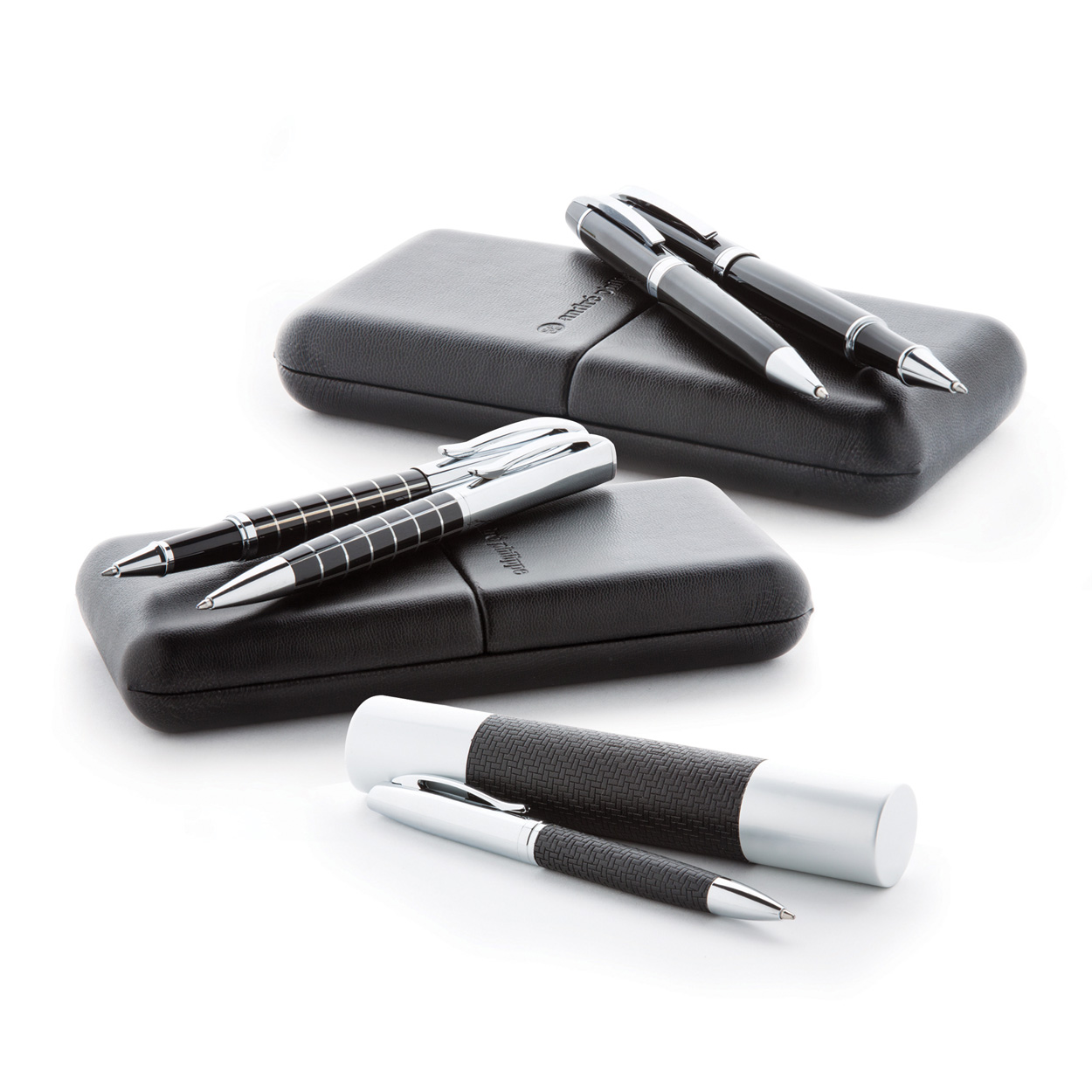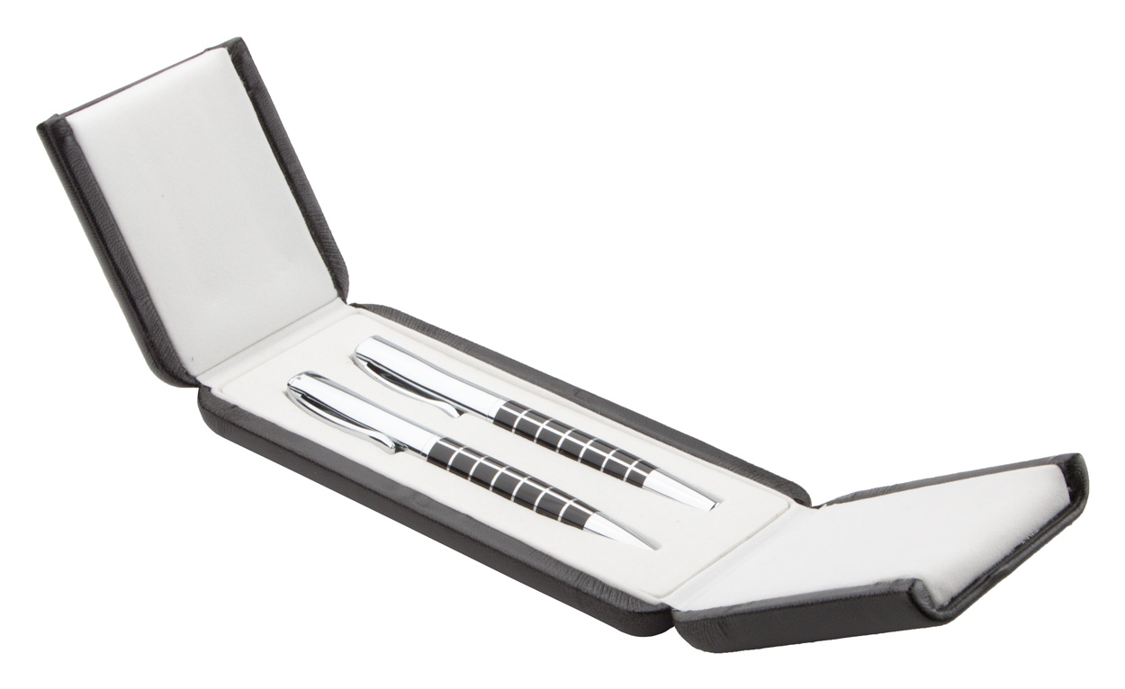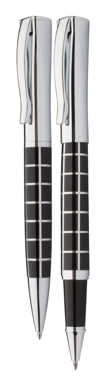 Sada per - elegantní kovové kuličkové pero a roller s lesklým chromovaným zdobením značky André Philippe. V dárkové krabičce z PU kůže a s modrou náplní.